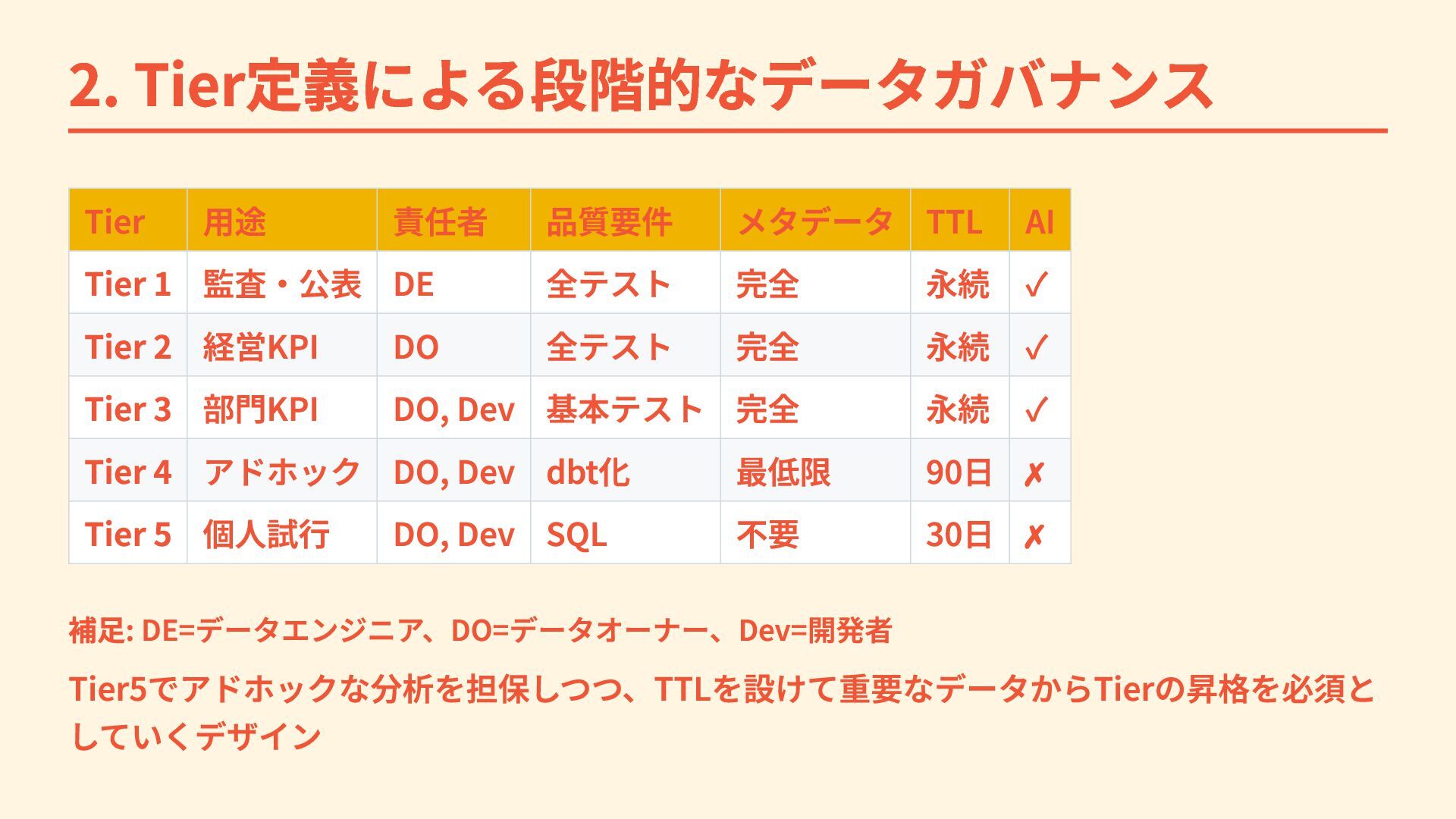 2. Tier定義による段階的なデータガバナンス Tier 用途 責任者 品質要件 メタデータ TTL AI Tier