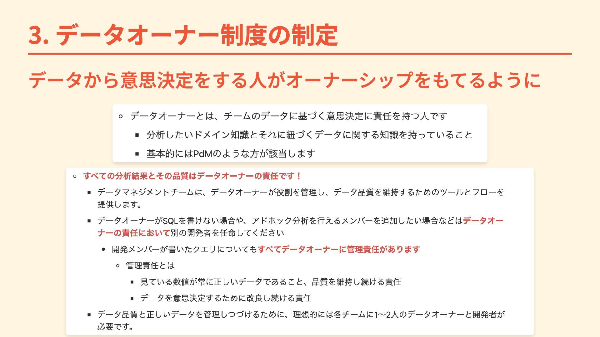 3. データオーナー制度の制定 データから意思決定をする人がオーナーシップをもてるように