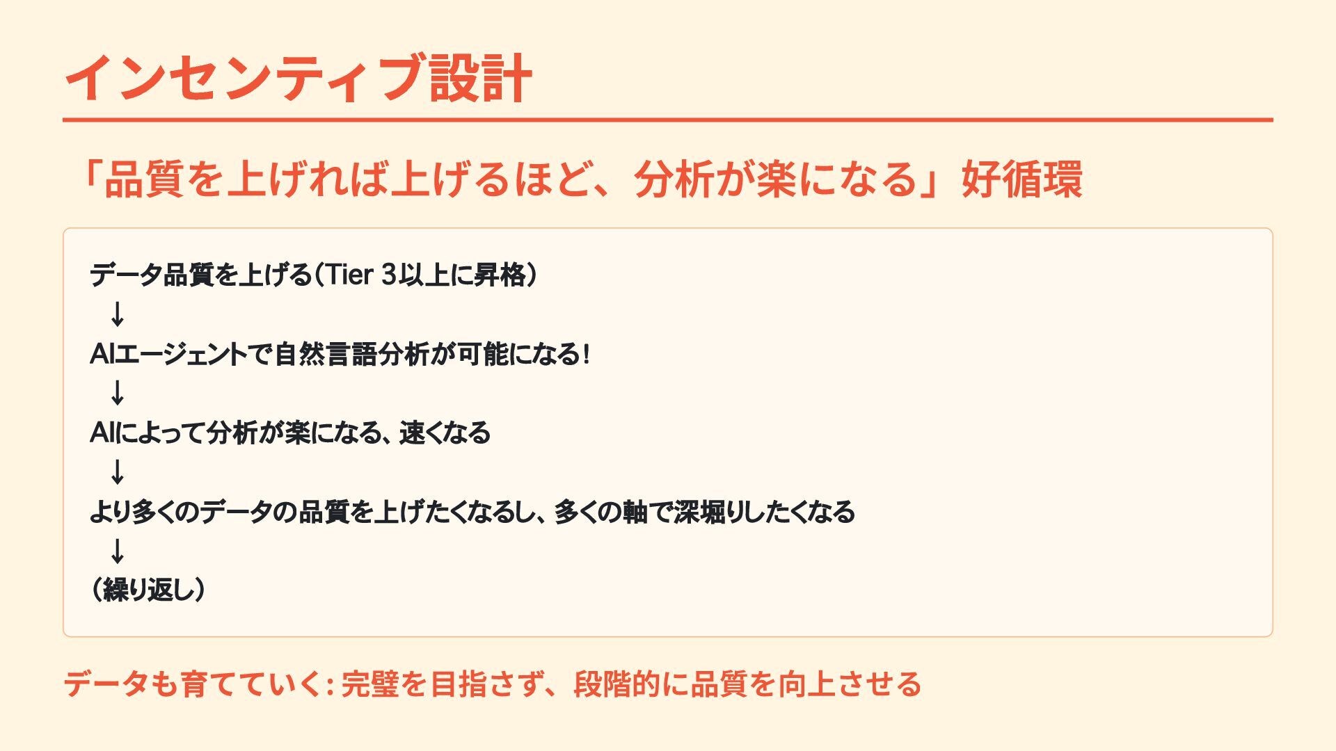 インセンティブ設計 「品質を上げれば上げるほど、分析が楽になる」好循環 データ品質を上げる(Tier 3以上に昇格) ↓ AIエージェントで自然言語分析が可能になる! ↓ AIによって分析が楽になる、速くなる ↓ より多くのデータの品質を上げたくなるし、多くの軸で深堀りしたくなる