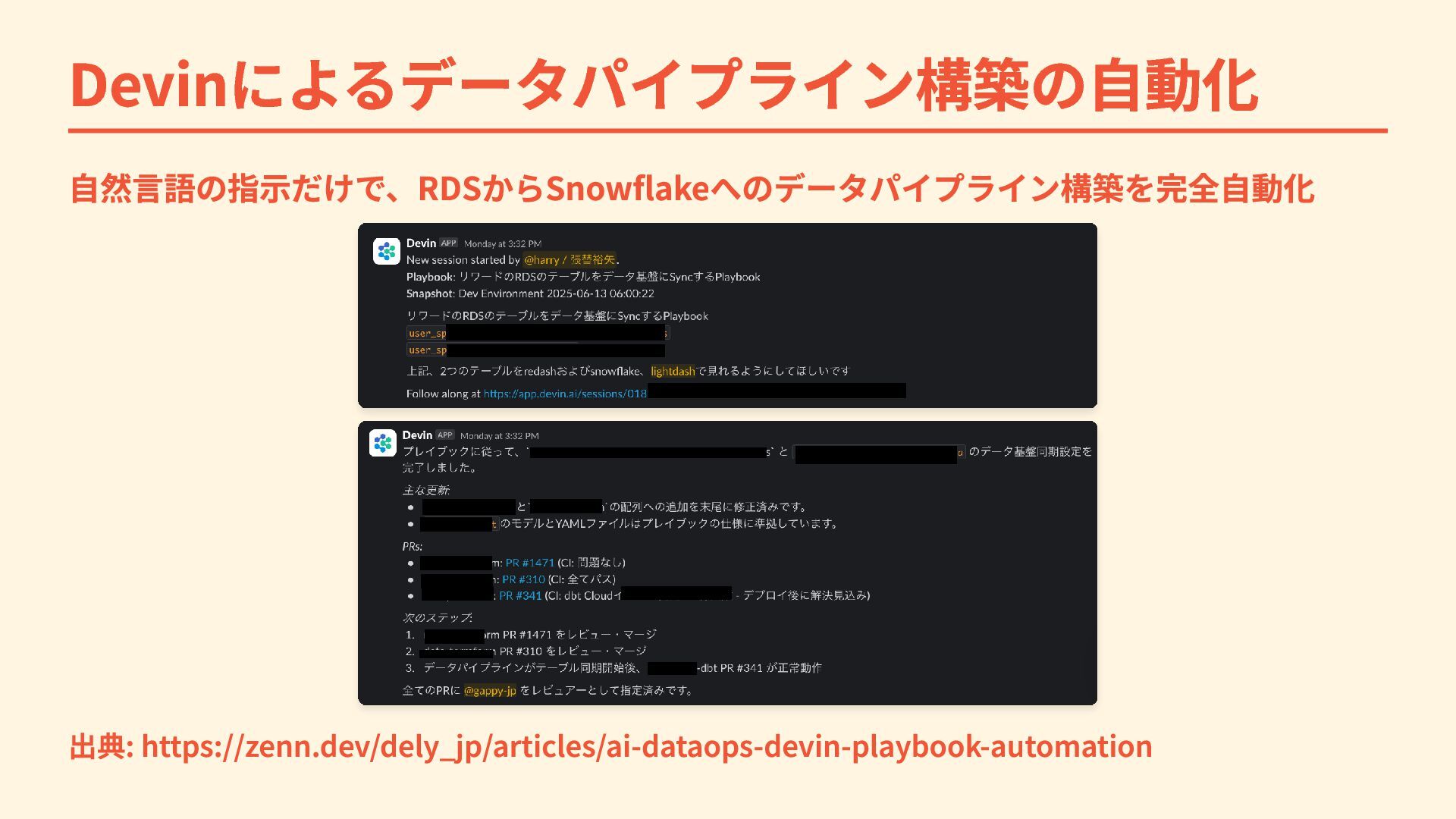 Devinによるデータパイプライン構築の自動化 自然言語の指示だけで、RDSからSnowflakeへのデータパイプライン構築を完全自動化 出典: https://zenn.dev/dely_jp/articles/ai-dataops-devin-playbook-automation