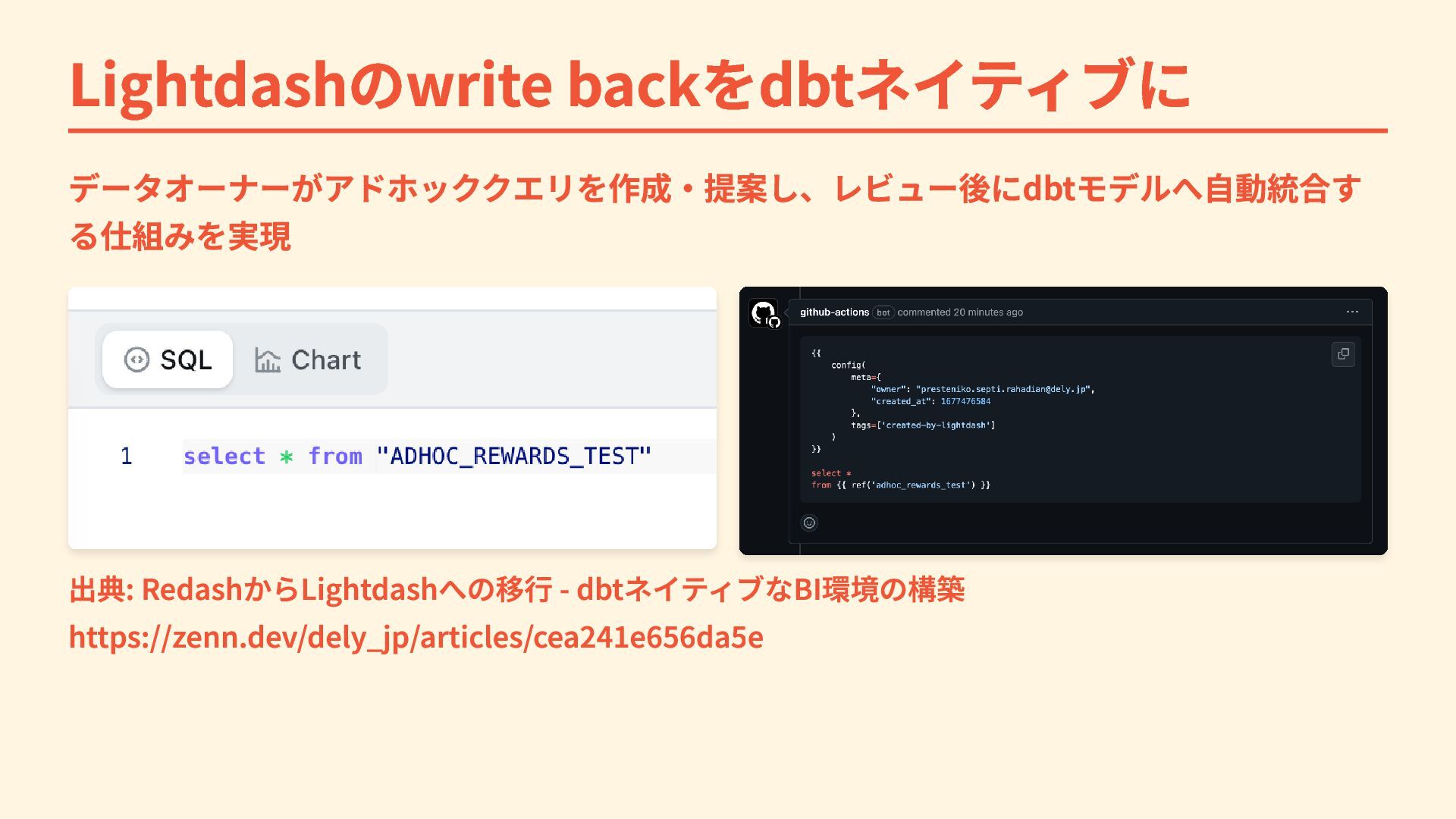Lightdashのwrite backをdbtネイティブに データオーナーがアドホッククエリを作成・提案し、レビュー後にdbtモデルへ自動統合す る仕組みを実現 出典: RedashからLightdashへの移行 - dbtネイティブなBI環境の構築 https://zenn.dev/dely_jp/articles/cea241e656da5e