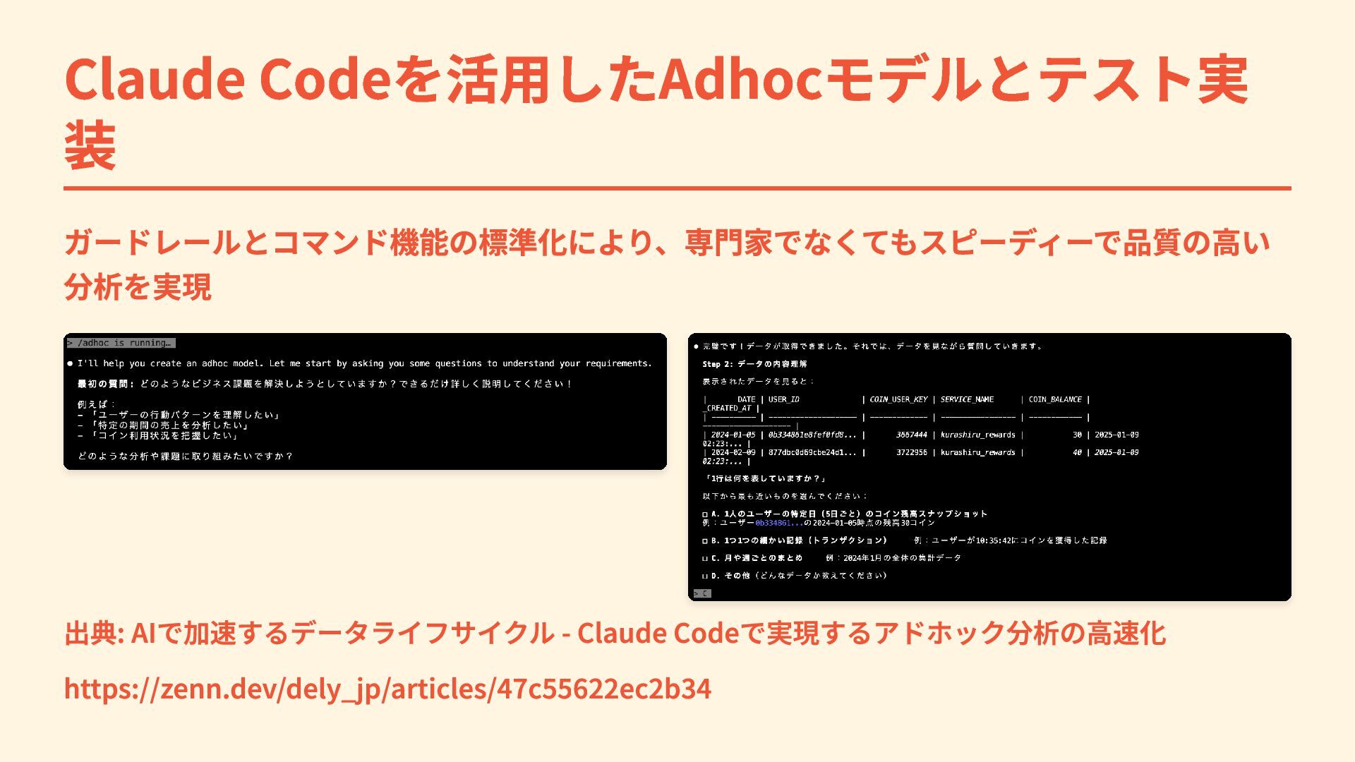 Claude Codeを活用したAdhocモデルとテスト実 装 ガードレールとコマンド機能の標準化により、専門家でなくてもスピーディーで品質の高い 分析を実現 出典: AIで加速するデータライフサイクル - Claude Codeで実現するアドホック分析の高速化