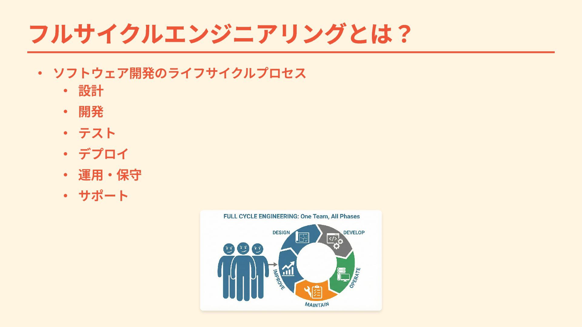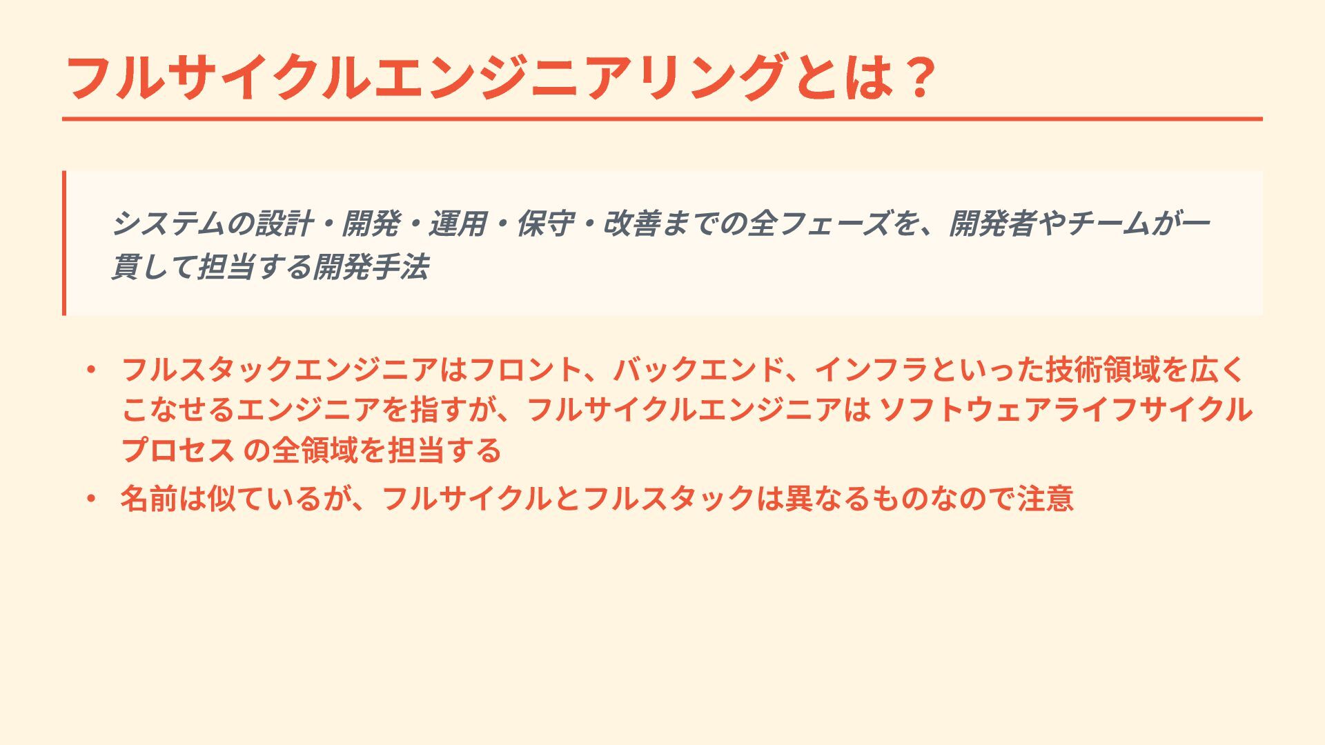 フルサイクルエンジニアリングとは? システムの設計・開発・運用・保守・改善までの全フェーズを、開発者やチームが一 貫して担当する開発手法 ・ フルスタックエンジニアはフロント、バックエンド、インフラといった技術領域を広く こなせるエンジニアを指すが、フルサイクルエンジニアは ソフトウェアライフサイクル プロセス の全領域を担当する ・