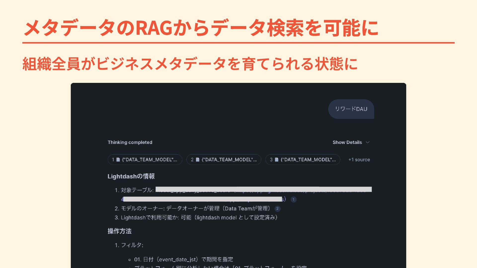 メタデータのRAGからデータ検索を可能に 組織全員がビジネスメタデータを育てられる状態に