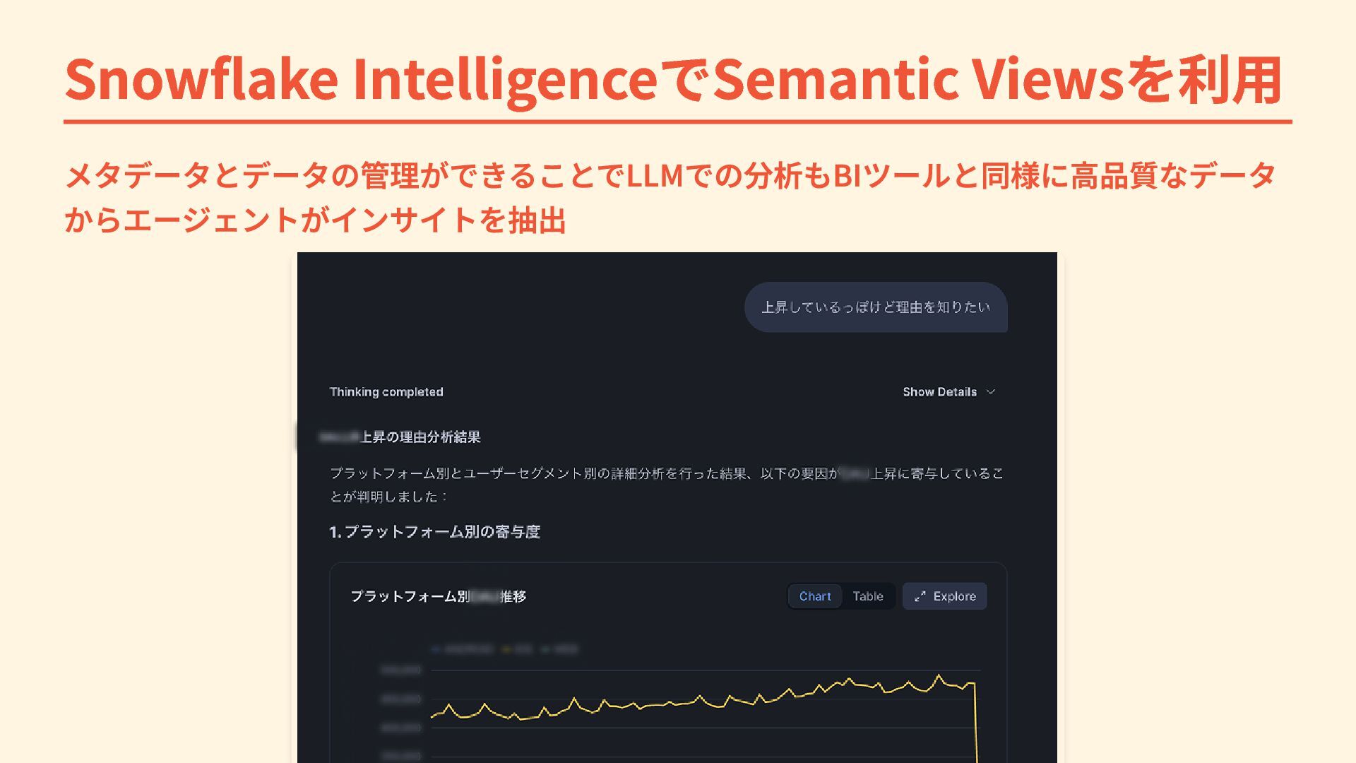Snowflake IntelligenceでSemantic Viewsを利用 メタデータとデータの管理ができることでLLMでの分析もBIツールと同様に高品質なデータ からエージェントがインサイトを抽出