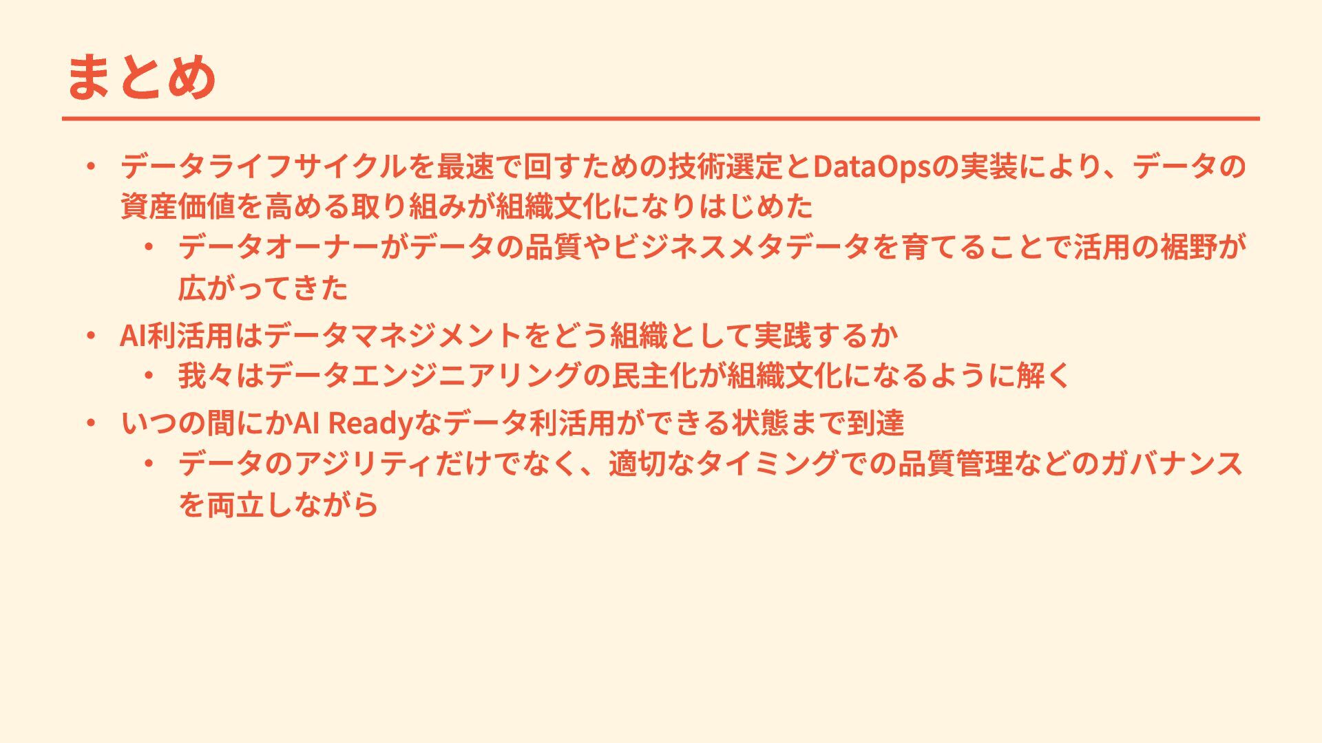 まとめ ・ データライフサイクルを最速で回すための技術選定とDataOpsの実装により、データの 資産価値を高める取り組みが組織文化になりはじめた ・ データオーナーがデータの品質やビジネスメタデータを育てることで活用の裾野が 広がってきた ・ AI利活用はデータマネジメントをどう組織として実践するか ・