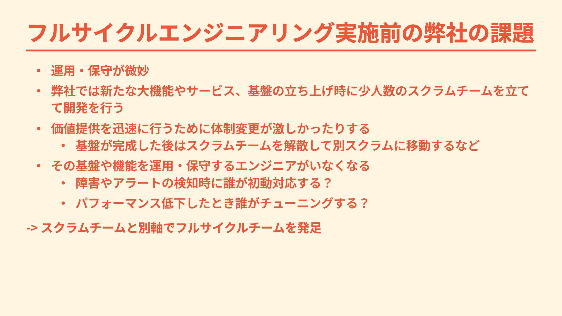 ・ その基盤や機能を運用・保守するエンジニアがいなくなる ・ 障害やアラートの検知時に誰が初動対応する? ・ パフォーマンス低下したとき誰がチューニングする? -> スクラムチームと別軸でフルサイクルチームを発足