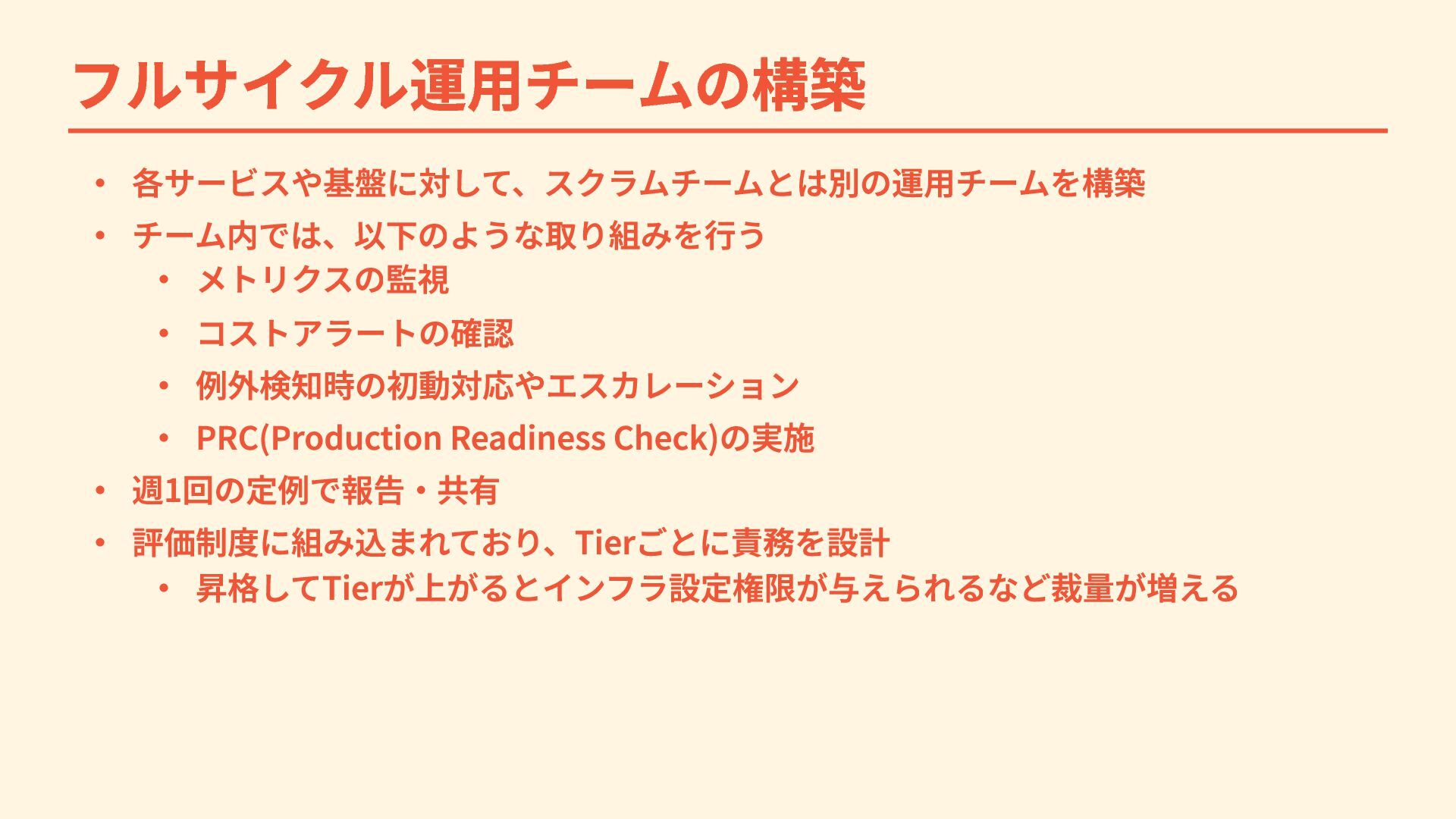 例外検知時の初動対応やエスカレーション ・ PRC(Production Readiness Check)の実施 ・ 週1回の定例で報告・共有 ・ 評価制度に組み込まれており、Tierごとに責務を設計 ・ 昇格してTierが上がるとインフラ設定権限が与えられるなど裁量が増える