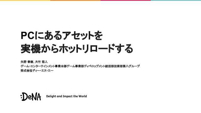 PCにあるアセットを 実機からホットリロードする 矢野 春樹, 大竹 悠人 ゲーム・エンターテインメント事業本部ゲーム事業部ディベロップメント統括部技術部第八グループ 株式会社ディー・エヌ・エー