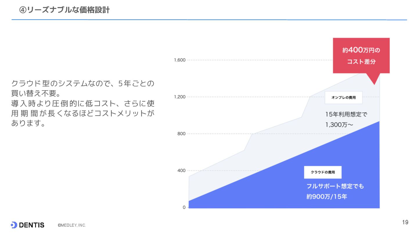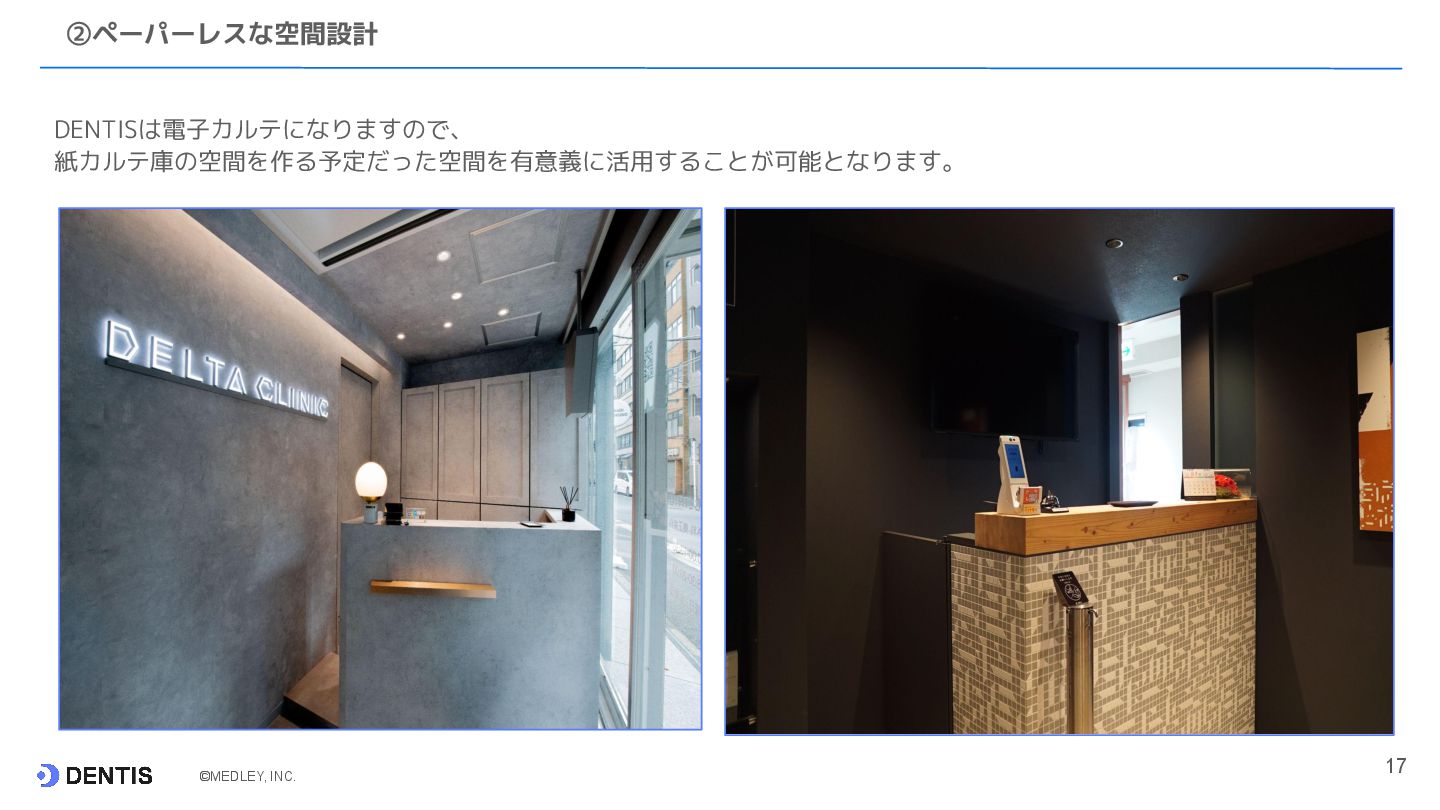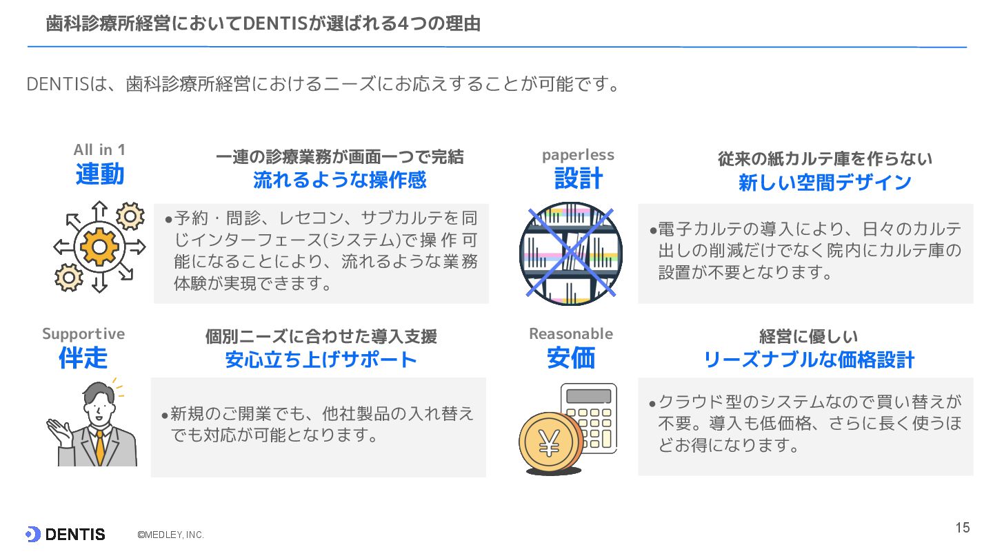 in 1 連動 Reasonable 安価 Supportive 伴走 •予約・問診、レセコン、サブカルテを同 じインターフェース(システム)で操 作 可 能になることにより、流れるような業務 体験が実現できます。 •新規のご開業でも、他社製品の入れ替え でも対応が可能となります。 •クラウド型のシステムなので買い替えが 不要。導入も低価格、さらに長く使うほ どお得になります。 paperless 設計 従来の紙カルテ庫を作らない 新しい空間デザイン •電子カルテの導入により、日々のカルテ 出しの削減だけでなく院内にカルテ庫の 設置が不要となります。 ©MEDLEY, INC.