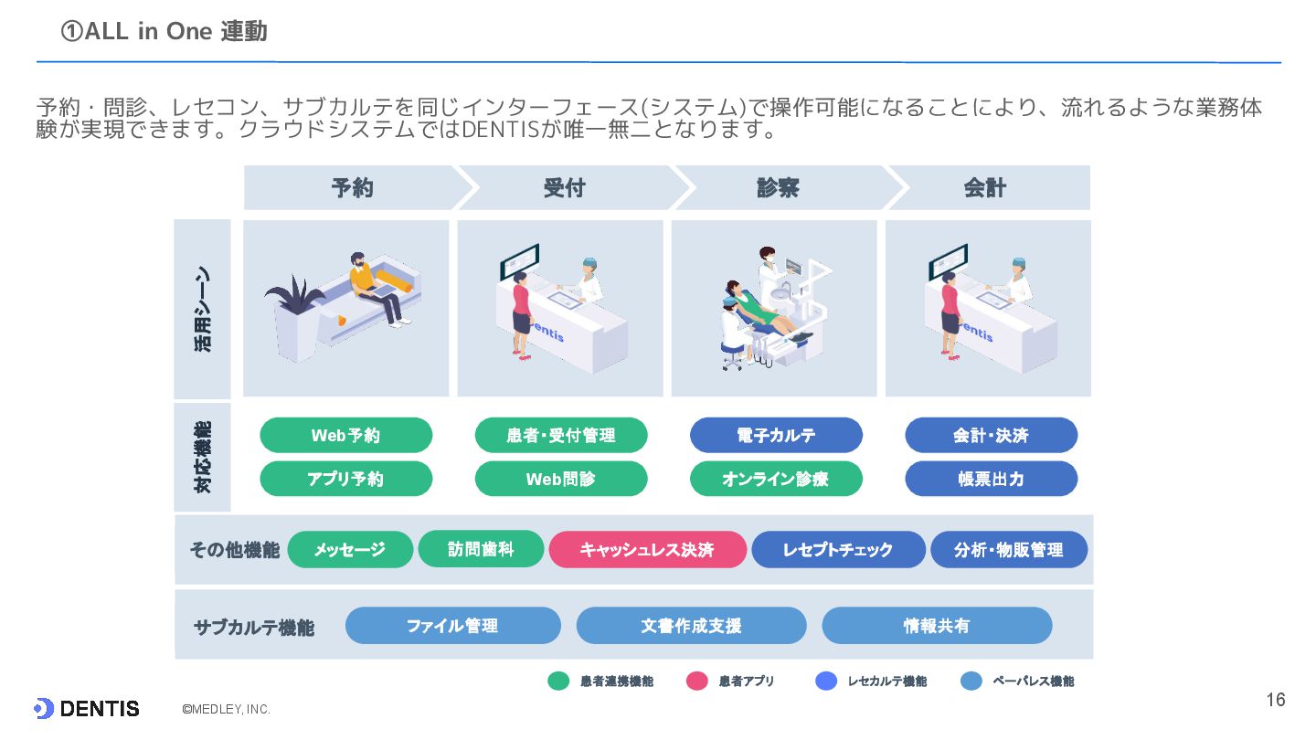 11. ①ALL in One 連動 16 予約・問診、レセコン、サブカルテを同じインターフェース(システム)で操作可能になることにより、流れるような業務体 験が実現できます。クラウドシステムではDENTISが唯一無二となります。 ©MEDLEY, INC. 会計