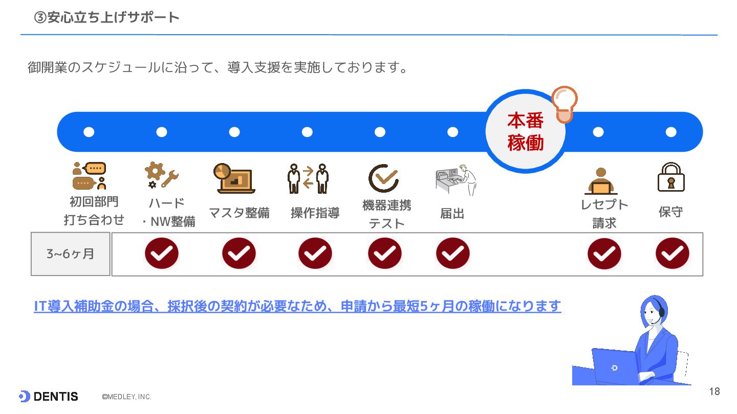 操作指導 保守 本番 稼働 御開業のスケジュールに沿って、導入支援を実施しております。 届出 レセプト 請求 ©MEDLEY, INC. IT導入補助金の場合、採択後の契約が必要なため、申請から最短5ヶ月の稼働になります