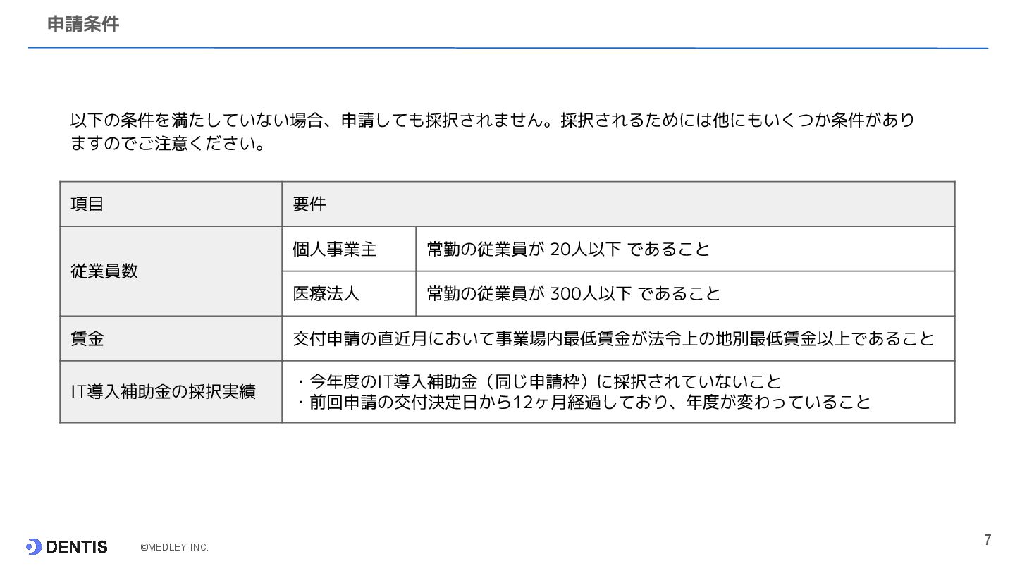 3. 7 ©MEDLEY, INC. 以下の条件を満たしていない場合、申請しても採択されません。採択されるためには他にもいくつか条件があり ますのでご注意ください。 項目 要件 従業員数 個人事業主 常勤の従業員が