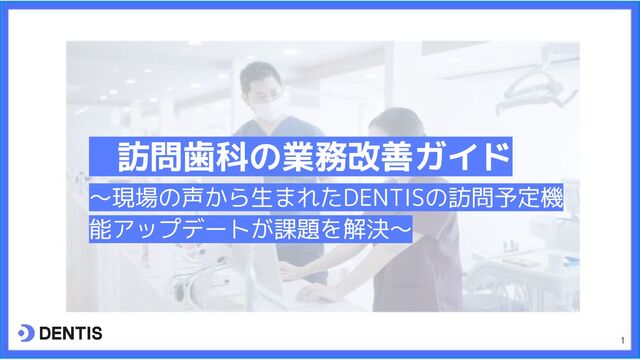時間の記録が大変 予定作成と診療記録が簡単に ・スケジュールとカルテが連動 ・PCやタブレットから直接入力、すぐ反映 個人情報を持ち運ぶことに不安を感じる 重要な情報も安全に持ち運び ・患者ごとのファイルストレージに重要な資料は保存・管理 ・クラウド型だからインターネット環境があればどこでもつながる ・端末だけ持ち運べば、情報は安全 記録が二重・三重に発生している 重記録ミス・二重入力ゼロに ・時間の記録をそのままカルテに反映 ・レセコン一体型の電子カルテだから転記不要 ALL in Oneのクラウド型システムDENTISならではのアプローチで訪問歯科診療を効率化