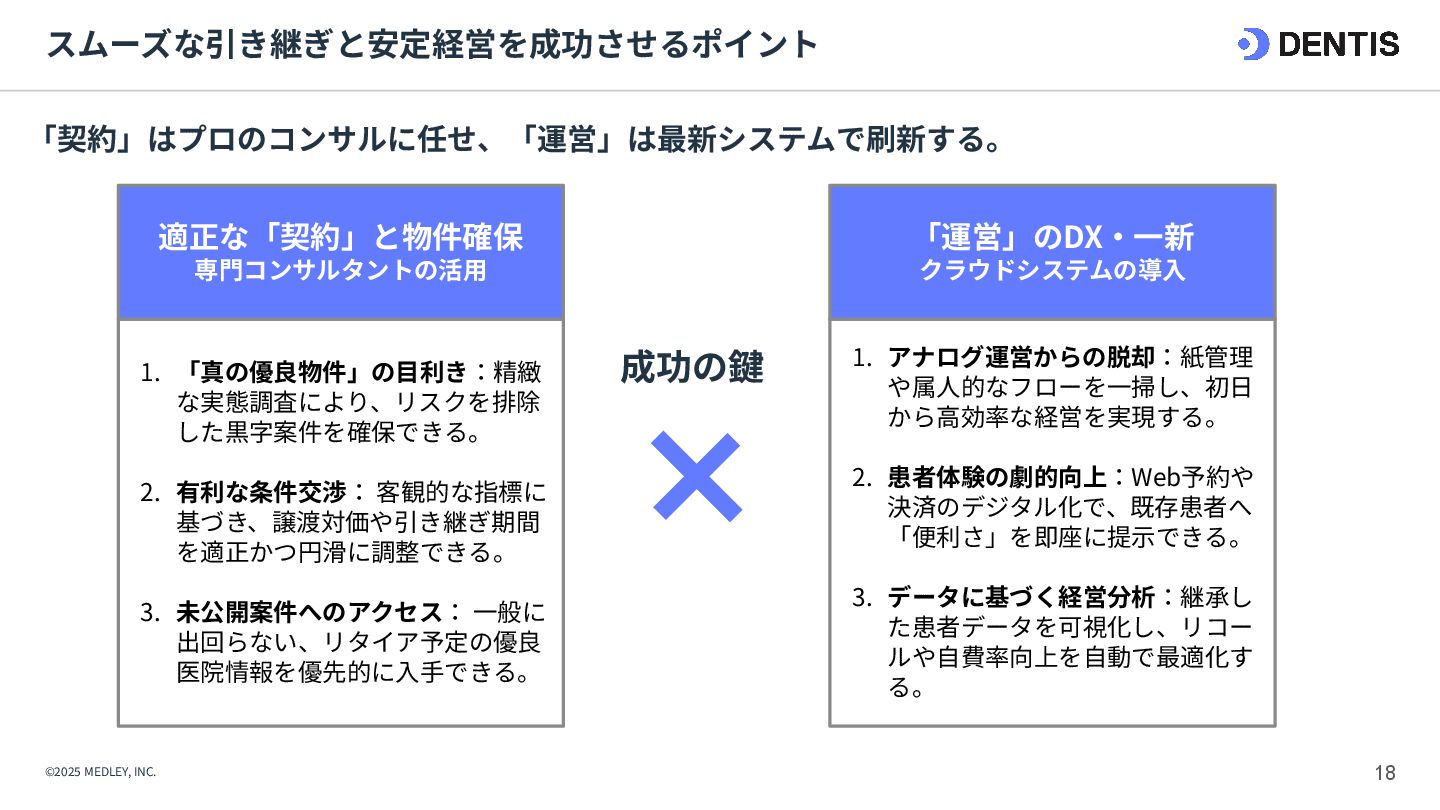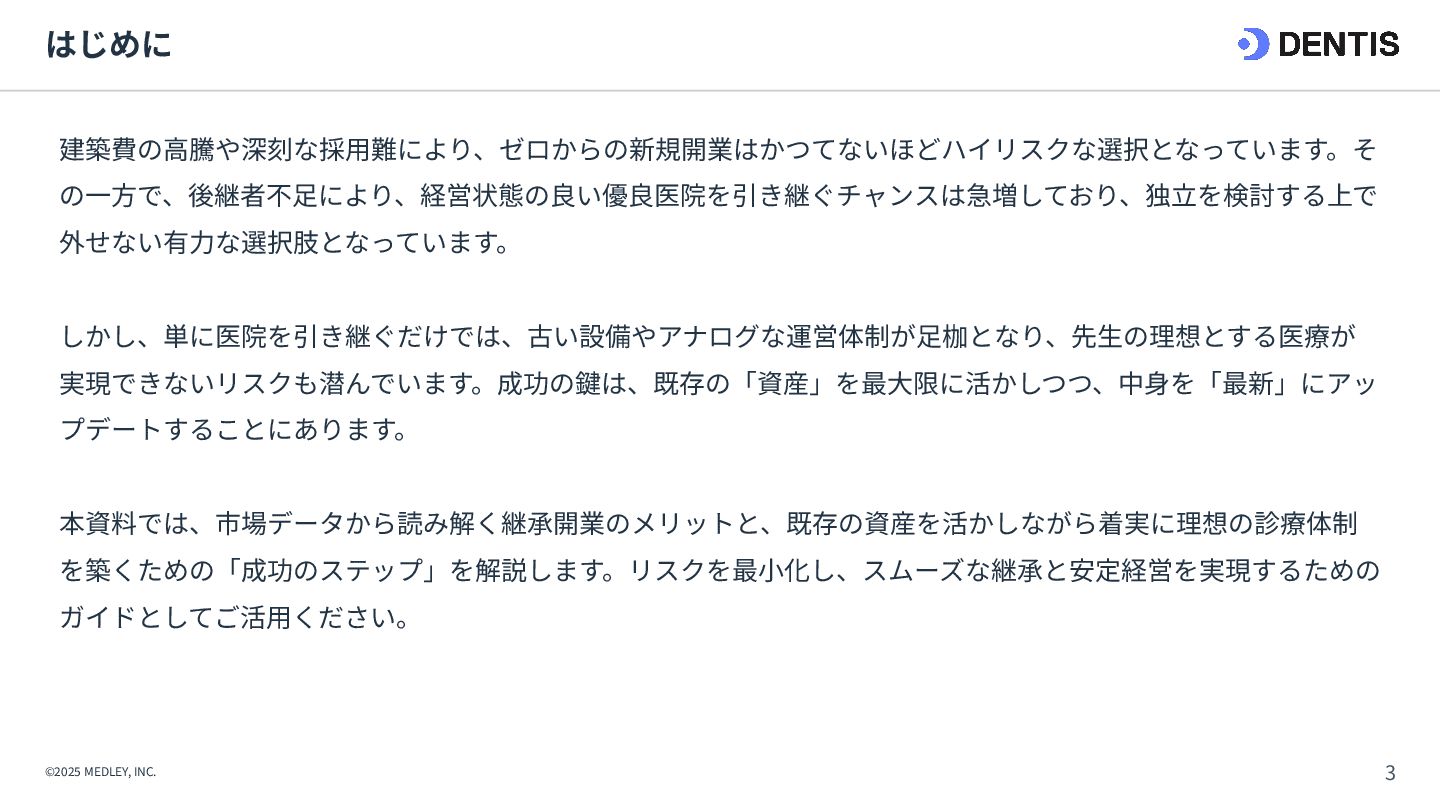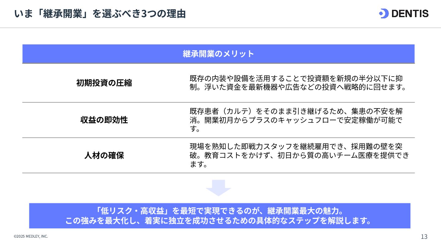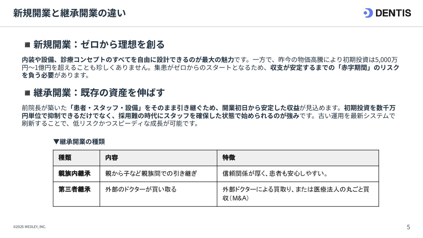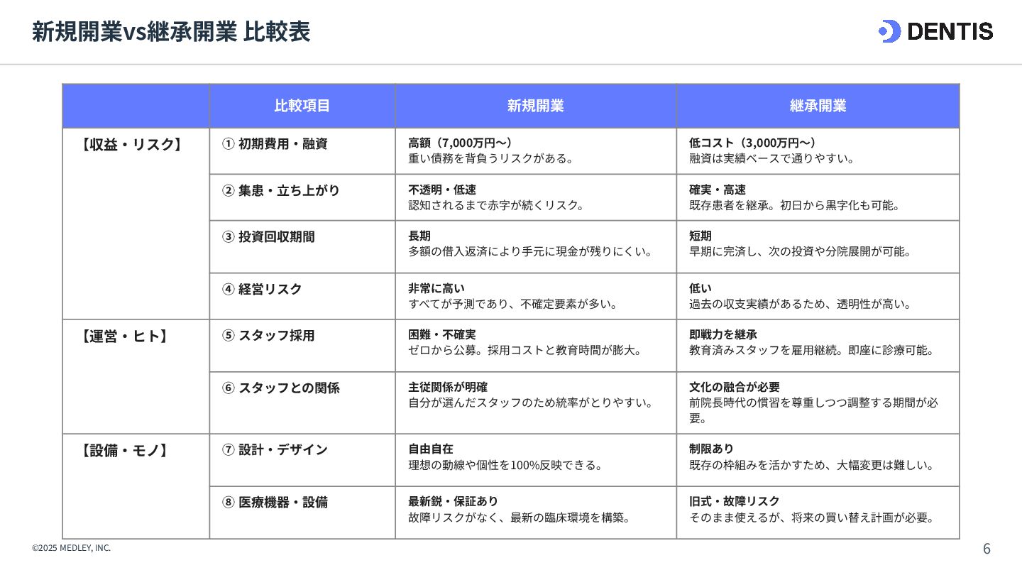 ① 初期費⽤‧融資 ⾼額(7,000万円〜) 重い債務を背負うリスクがある。 低コスト(3,000万円〜) 融資は実績ベースで通りやすい。 ② 集患‧⽴ち上がり 不透明‧低速 認知されるまで⾚字が続くリスク。 確実‧⾼速 既存患者を継承。初⽇から黒字化も可能。 ③ 投資回収期間 ⻑期 多額の借⼊返済により⼿元に現⾦が残りにくい。 短期 早期に完済し、次の投資や分院展開が可能。 ④ 経営リスク ⾮常に⾼い すべてが予測であり、不確定要素が多い。 低い 過去の収⽀実績があるため、透明性が⾼い。 【運営‧ヒト】 ⑤ スタッフ採⽤ 困難‧不確実 ゼロから公募。採⽤コストと教育時間が膨⼤。 即戦⼒を継承 教育済みスタッフを雇⽤継続。即座に診療可能。 ⑥ スタッフとの関係 主従関係が明確 ⾃分が選んだスタッフのため統率がとりやすい。 ⽂化の融合が必要 前院⻑時代の慣習を尊重しつつ調整する期間が必 要。 【設備‧モノ】 ⑦ 設計‧デザイン ⾃由⾃在 理想の動線や個性を100%反映できる。 制限あり 既存の枠組みを活かすため、⼤幅変更は難しい。 ⑧ 医療機器‧設備 最新鋭‧保証あり 故障リスクがなく、最新の臨床環境を構築。 旧式‧故障リスク そのまま使えるが、将来の買い替え計画が必要。