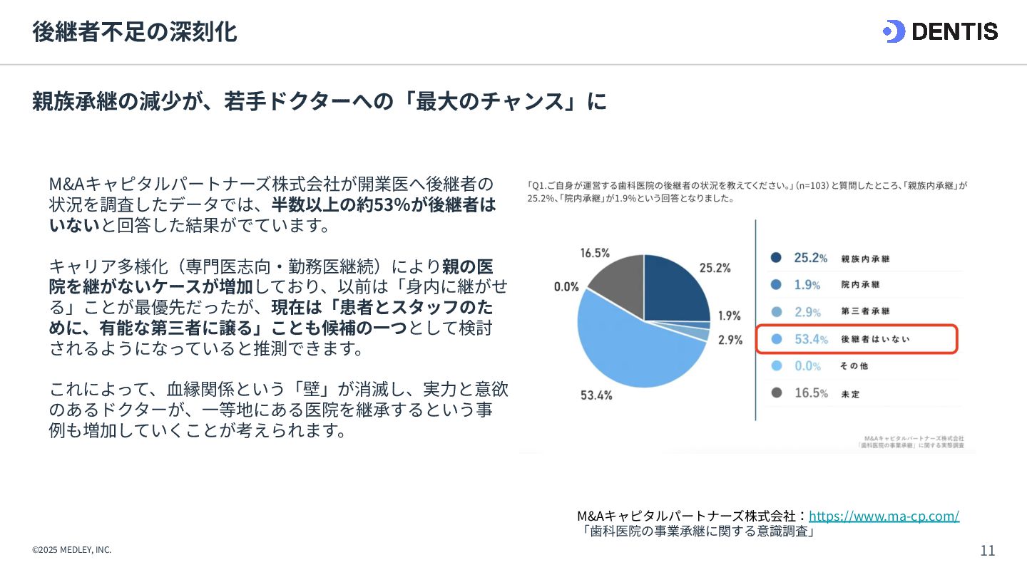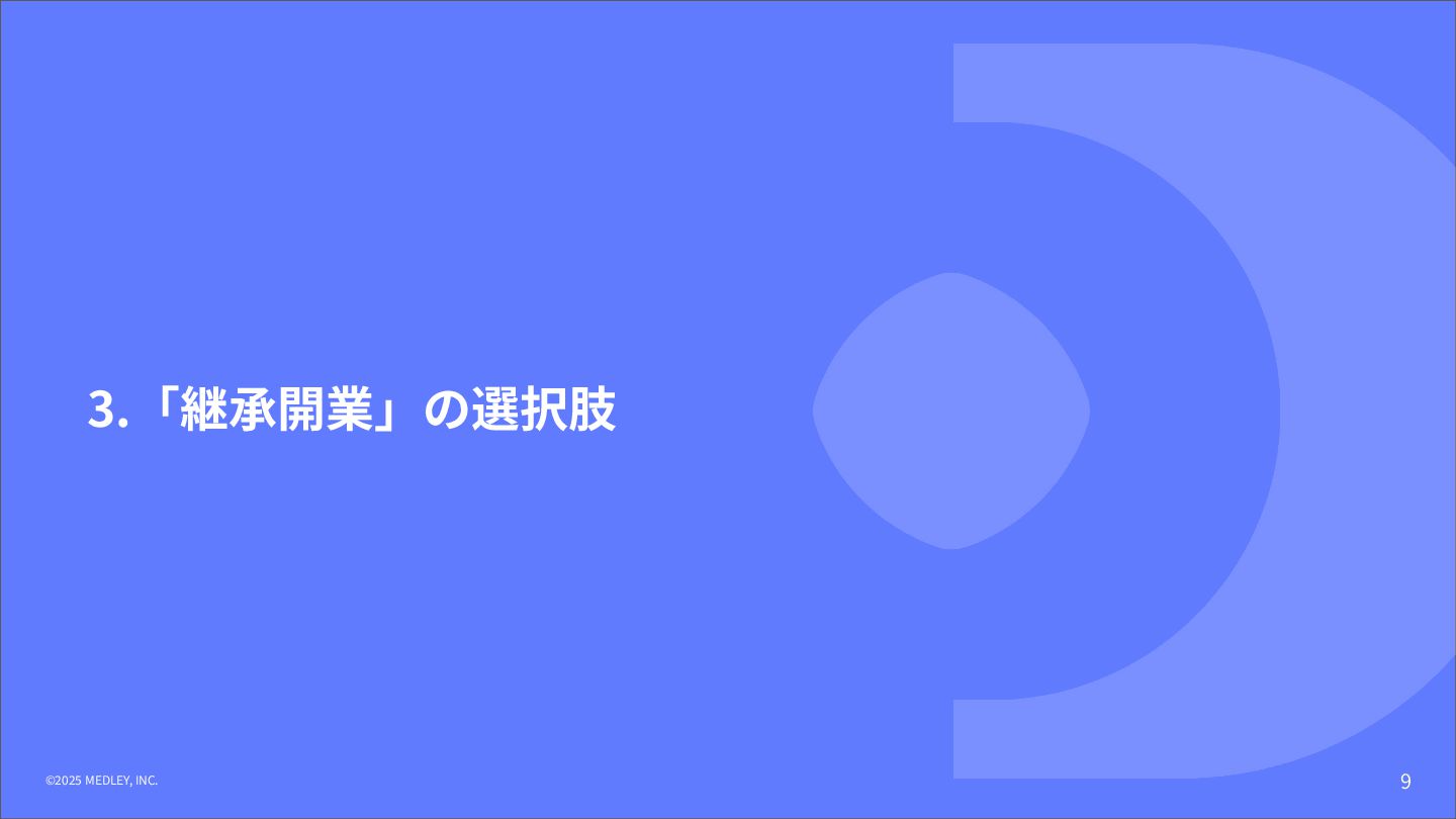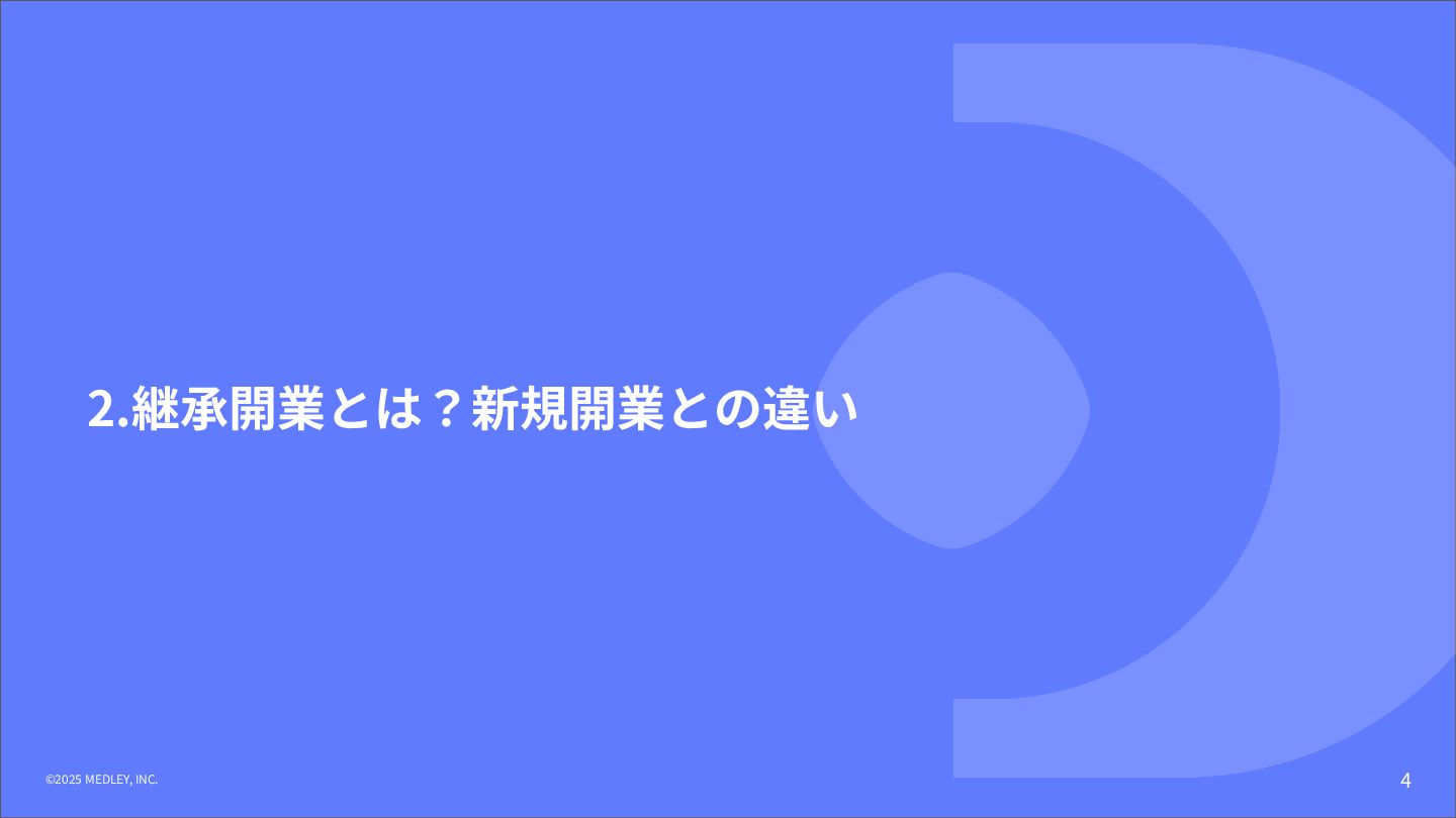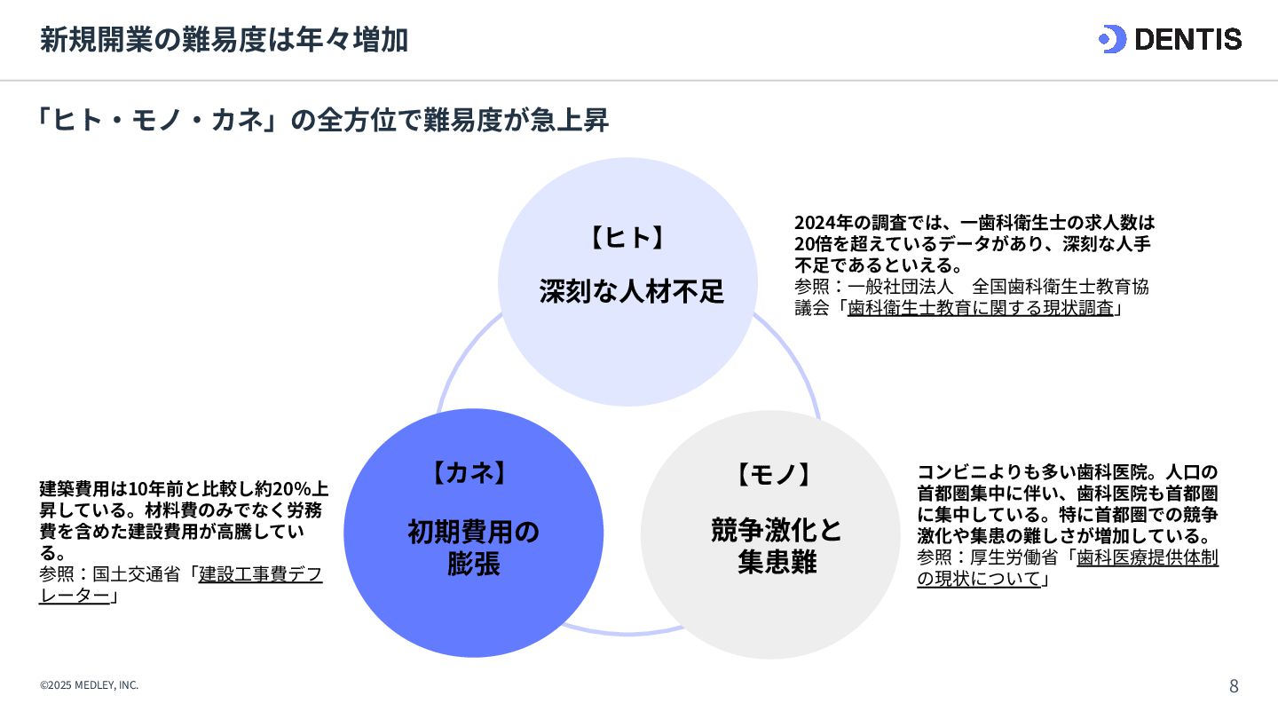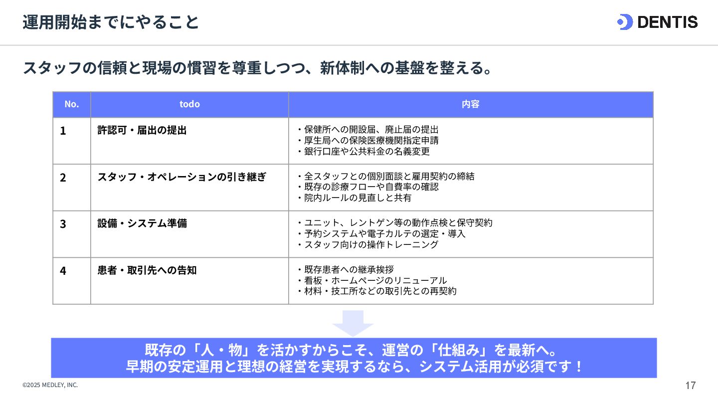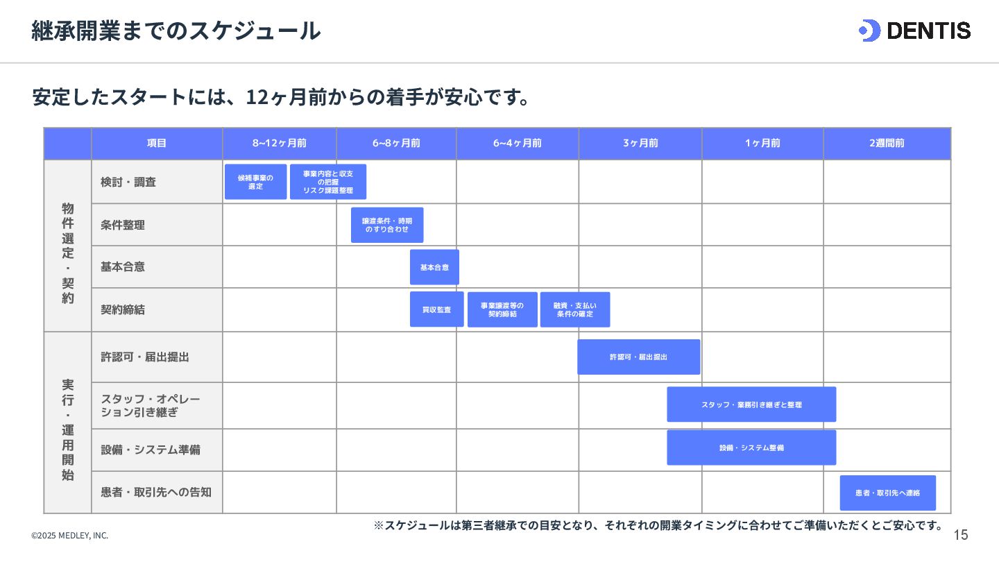 ① 初期費⽤‧融資 ⾼額(7,000万円〜) 重い債務を背負うリスクがある。 低コスト(3,000万円〜) 融資は実績ベースで通りやすい。 ② 集患‧⽴ち上がり 不透明‧低速 認知されるまで⾚字が続くリスク。 確実‧⾼速 既存患者を継承。初⽇から黒字化も可能。 ③ 投資回収期間 ⻑期 多額の借⼊返済により⼿元に現⾦が残りにくい。 短期 早期に完済し、次の投資や分院展開が可能。 ④ 経営リスク ⾮常に⾼い すべてが予測であり、不確定要素が多い。 低い 過去の収⽀実績があるため、透明性が⾼い。 【運営‧ヒト】 ⑤ スタッフ採⽤ 困難‧不確実 ゼロから公募。採⽤コストと教育時間が膨⼤。 即戦⼒を継承 教育済みスタッフを雇⽤継続。即座に診療可能。 ⑥ スタッフとの関係 主従関係が明確 ⾃分が選んだスタッフのため統率がとりやすい。 ⽂化の融合が必要 前院⻑時代の慣習を尊重しつつ調整する期間が必 要。 【設備‧モノ】 ⑦ 設計‧デザイン ⾃由⾃在 理想の動線や個性を100%反映できる。 制限あり 既存の枠組みを活かすため、⼤幅変更は難しい。 ⑧ 医療機器‧設備 最新鋭‧保証あり 故障リスクがなく、最新の臨床環境を構築。 旧式‧故障リスク そのまま使えるが、将来の買い替え計画が必要。