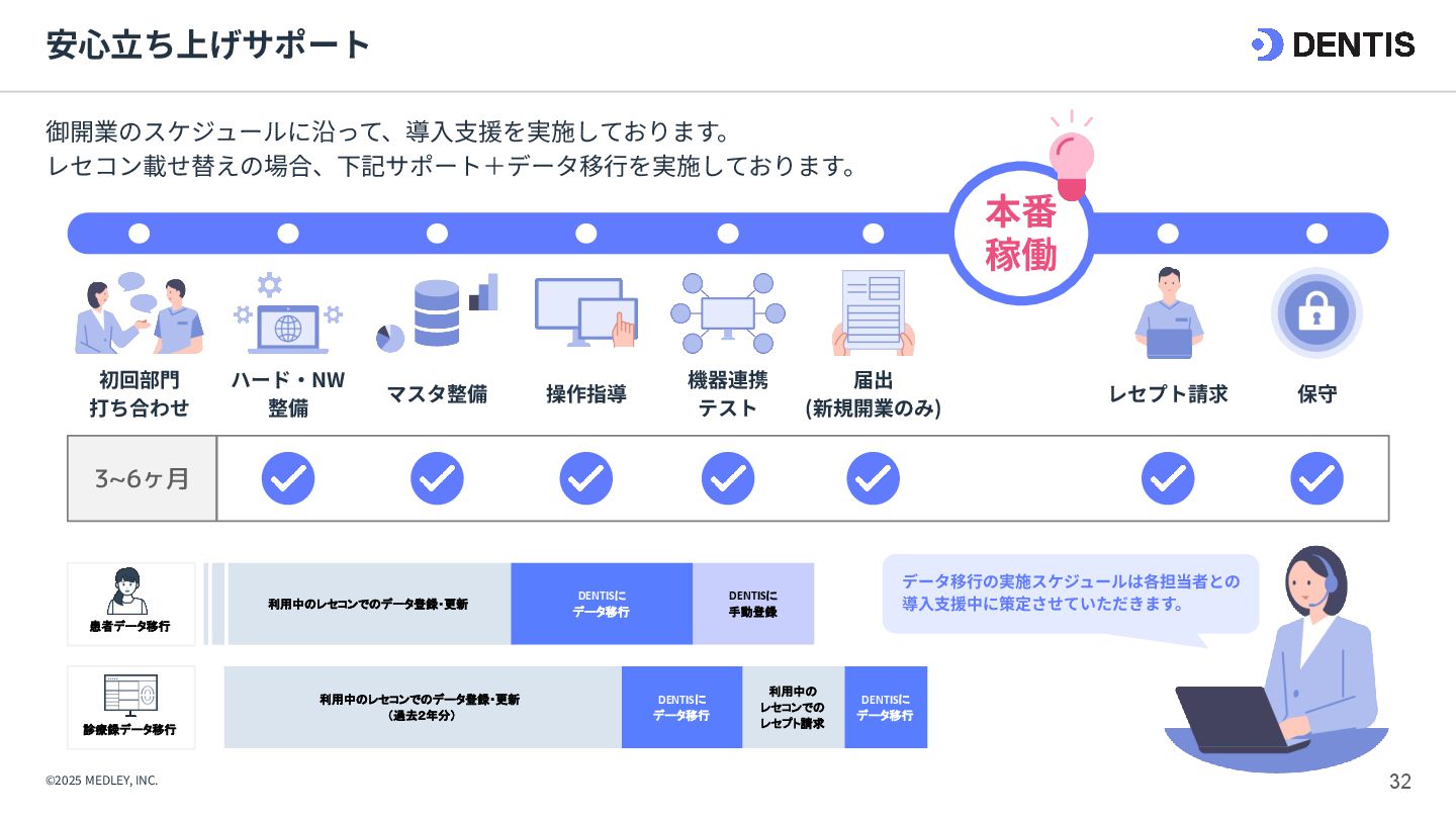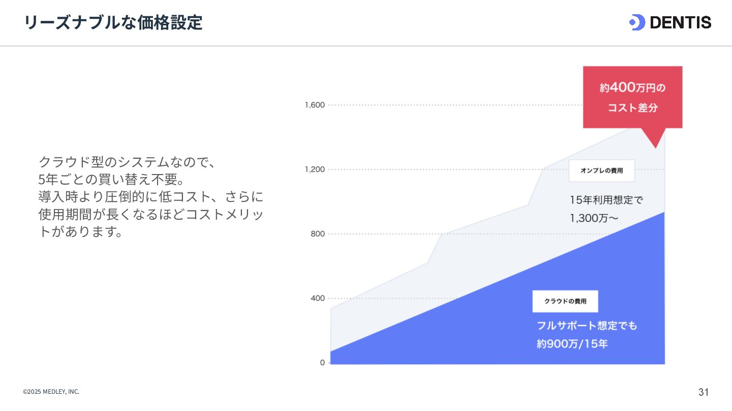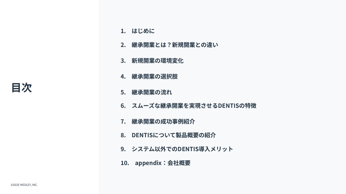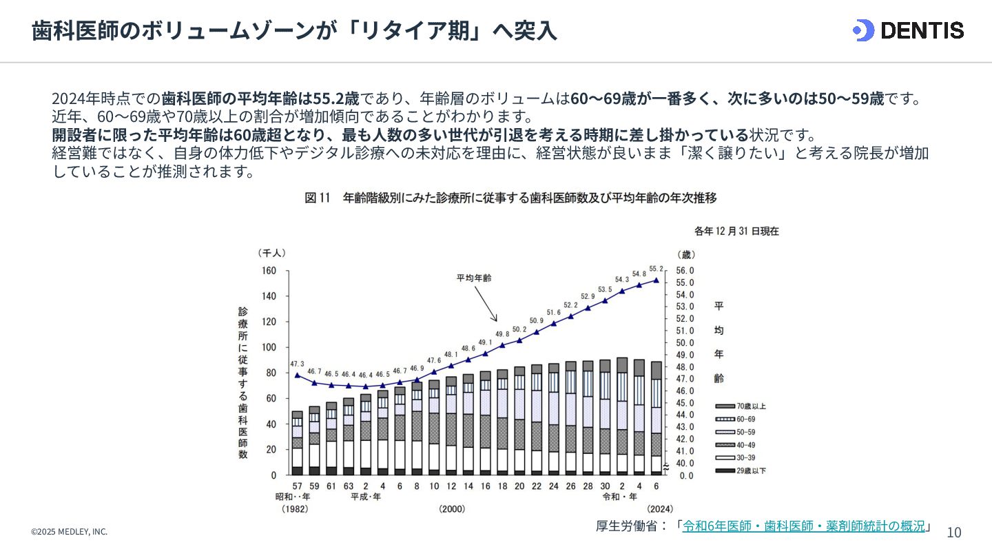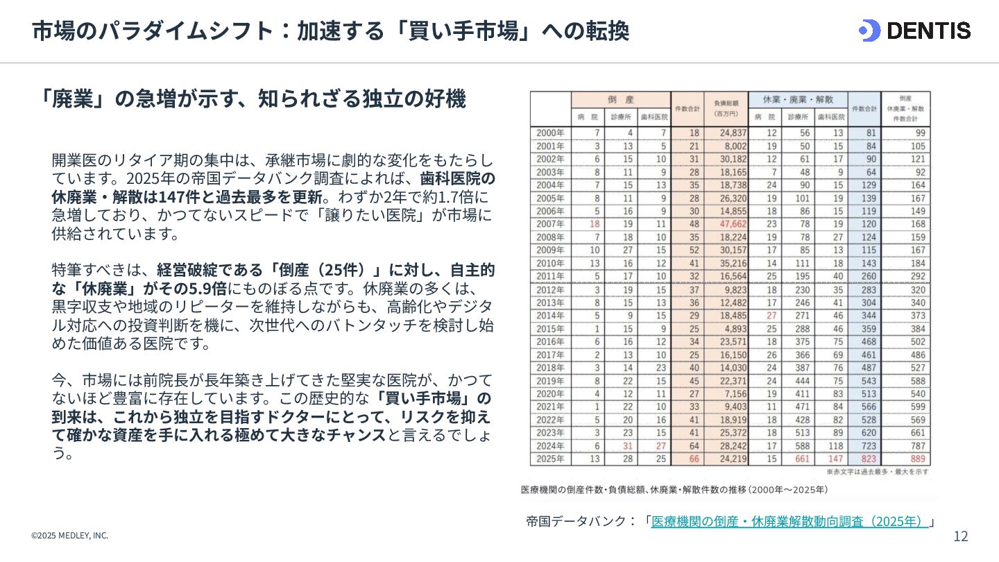 ① 初期費⽤‧融資 ⾼額(7,000万円〜) 重い債務を背負うリスクがある。 低コスト(3,000万円〜) 融資は実績ベースで通りやすい。 ② 集患‧⽴ち上がり 不透明‧低速 認知されるまで⾚字が続くリスク。 確実‧⾼速 既存患者を継承。初⽇から黒字化も可能。 ③ 投資回収期間 ⻑期 多額の借⼊返済により⼿元に現⾦が残りにくい。 短期 早期に完済し、次の投資や分院展開が可能。 ④ 経営リスク ⾮常に⾼い すべてが予測であり、不確定要素が多い。 低い 過去の収⽀実績があるため、透明性が⾼い。 【運営‧ヒト】 ⑤ スタッフ採⽤ 困難‧不確実 ゼロから公募。採⽤コストと教育時間が膨⼤。 即戦⼒を継承 教育済みスタッフを雇⽤継続。即座に診療可能。 ⑥ スタッフとの関係 主従関係が明確 ⾃分が選んだスタッフのため統率がとりやすい。 ⽂化の融合が必要 前院⻑時代の慣習を尊重しつつ調整する期間が必 要。 【設備‧モノ】 ⑦ 設計‧デザイン ⾃由⾃在 理想の動線や個性を100%反映できる。 制限あり 既存の枠組みを活かすため、⼤幅変更は難しい。 ⑧ 医療機器‧設備 最新鋭‧保証あり 故障リスクがなく、最新の臨床環境を構築。 旧式‧故障リスク そのまま使えるが、将来の買い替え計画が必要。