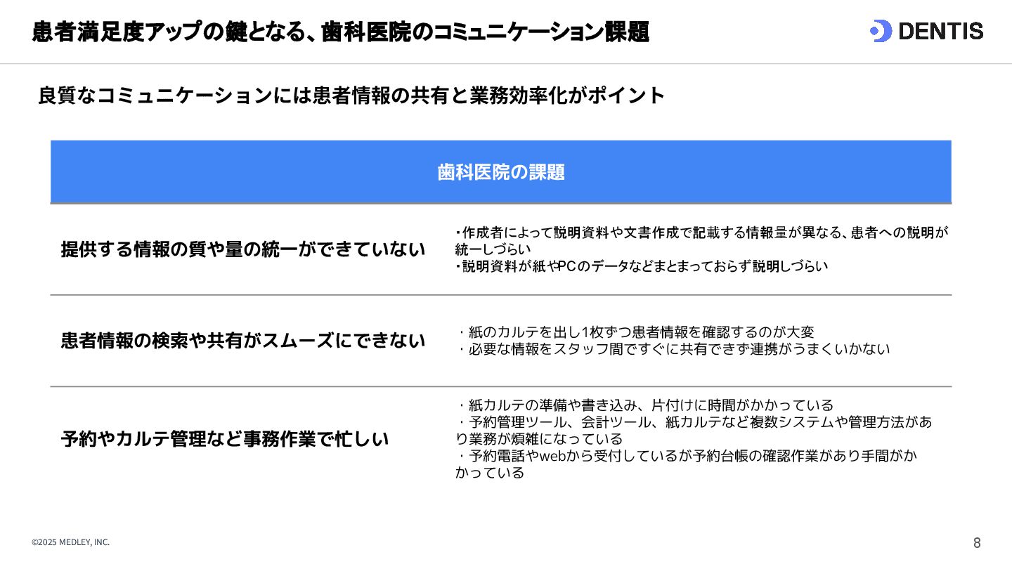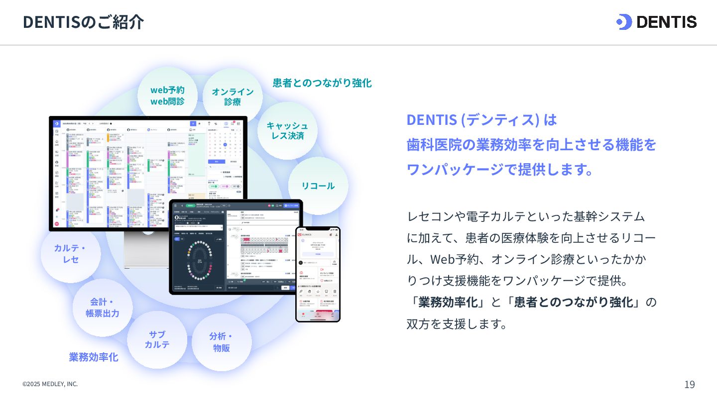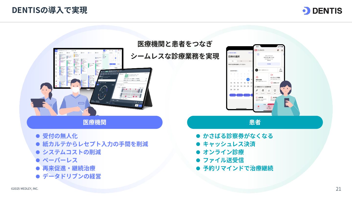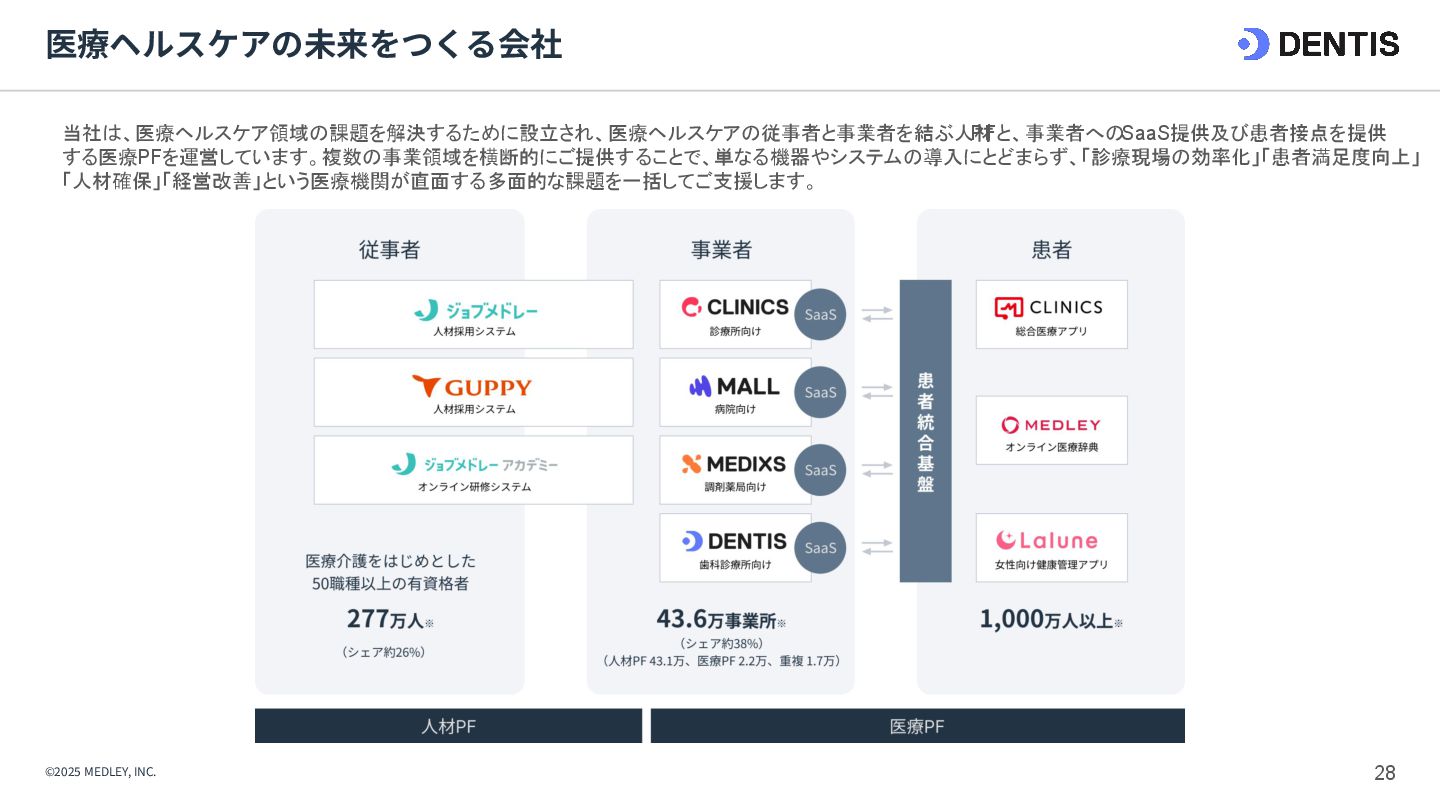 設立日 2009年6月5日 事業内容 人材プラットフォーム事業 医療プラットフォーム事業 代表者 代表取締役社長 瀧口 浩平 従業員数 1,487名(2024年12月末時点) グループ会社 株式会社パシフィックメディカル 株式会社メドレーフィナンシャルサービス 株式会社ASFON TRUST NETWORK アクシスルートホールディングス株式会社 株式会社メドレーウィズ MEDLEY US, Inc. Medley Philippines Inc. 人材プラットフォーム事業 ジョブメドレー(人材採用システム)、ジョブメドレーアカデミー(オンライン研修事業) 「ジョブメドレーアカデミー(オンライン研修事業)」 医療プラットフォーム事業 DENTIS(歯科向けシステム)、CLINICS(医科向けシステム)、 Pharms(薬局向けシステム)、 MEDLEY(患者向け医療情報サービス)、 MALL(病院向け電子カルテ) 株式会社メドレーは 2009年より「医療ヘルスケアの未来をつくる 」をミッションに事業展開 DENTISは歯科領域事業として 2022年1月からサービス開始 27 オンライン動画研修サービス 納得できる⽼⼈ホーム探し 医師たちがつくるオンライン医療事典 クラウド診療⽀援システム かかりつけ薬局⽀援システム 医療介護の求⼈サイト 病院向け電⼦カルテ 医療‧介護‧在宅連携ソリューション クラウド⻭科業務⽀援システム