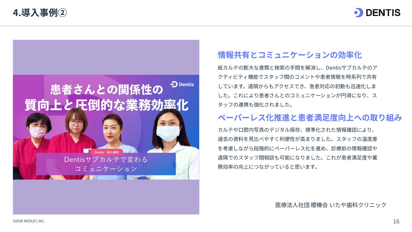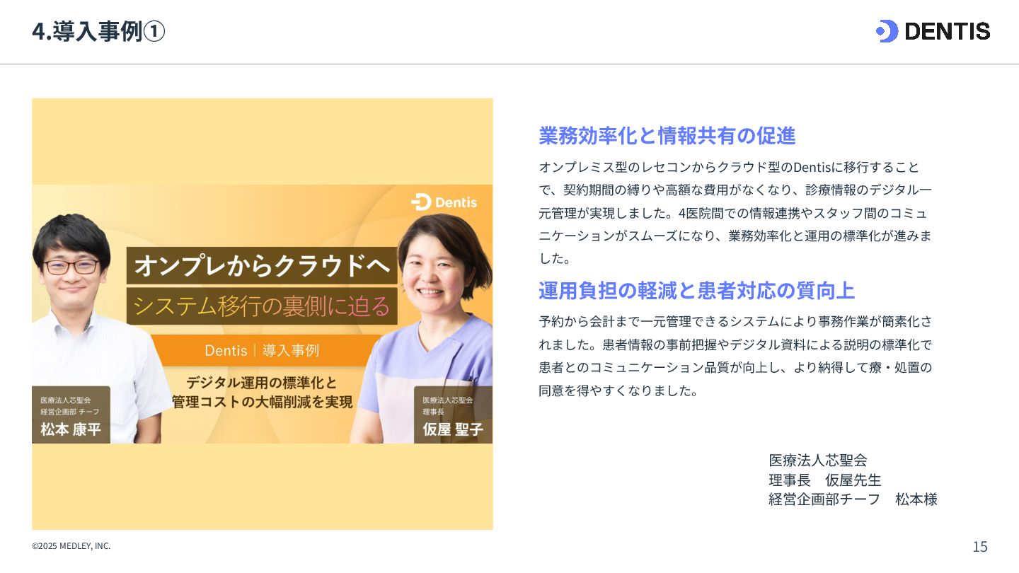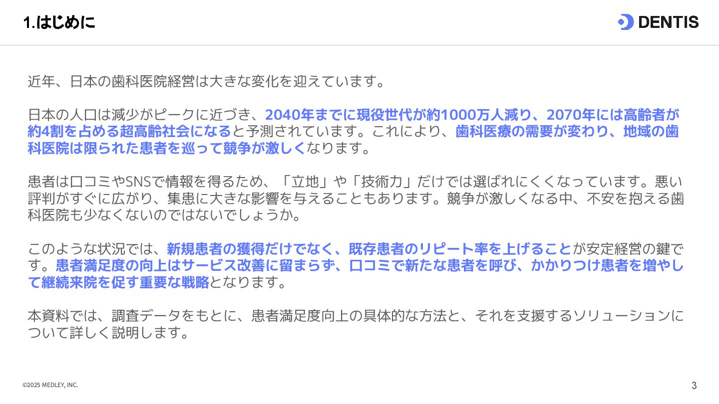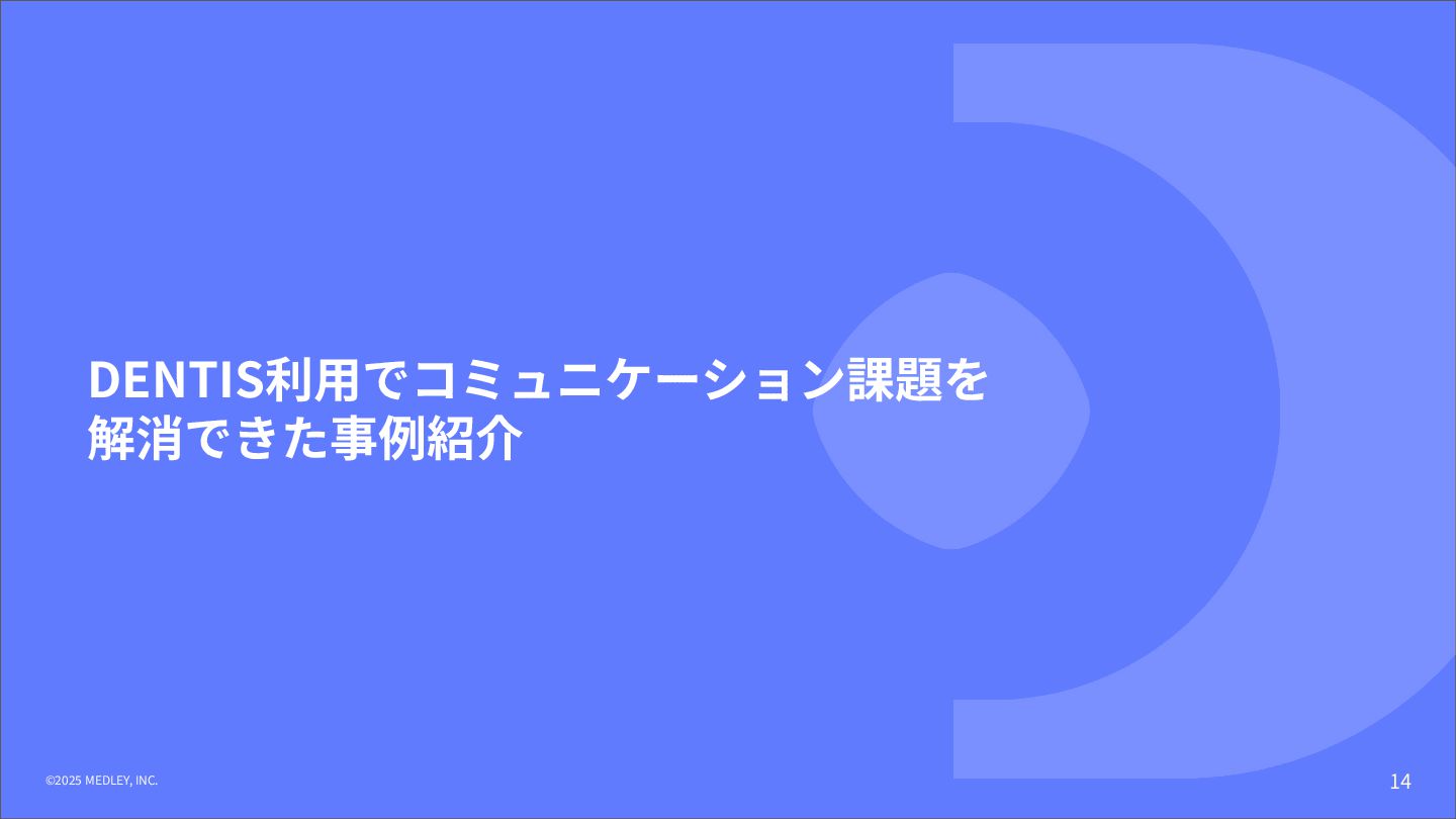 設立日 2009年6月5日 事業内容 人材プラットフォーム事業 医療プラットフォーム事業 代表者 代表取締役社長 瀧口 浩平 従業員数 1,487名(2024年12月末時点) グループ会社 株式会社パシフィックメディカル 株式会社メドレーフィナンシャルサービス 株式会社ASFON TRUST NETWORK アクシスルートホールディングス株式会社 株式会社メドレーウィズ MEDLEY US, Inc. Medley Philippines Inc. 人材プラットフォーム事業 ジョブメドレー(人材採用システム)、ジョブメドレーアカデミー(オンライン研修事業) 「ジョブメドレーアカデミー(オンライン研修事業)」 医療プラットフォーム事業 DENTIS(歯科向けシステム)、CLINICS(医科向けシステム)、 Pharms(薬局向けシステム)、 MEDLEY(患者向け医療情報サービス)、 MALL(病院向け電子カルテ) 株式会社メドレーは 2009年より「医療ヘルスケアの未来をつくる 」をミッションに事業展開 DENTISは歯科領域事業として 2022年1月からサービス開始 27 オンライン動画研修サービス 納得できる⽼⼈ホーム探し 医師たちがつくるオンライン医療事典 クラウド診療⽀援システム かかりつけ薬局⽀援システム 医療介護の求⼈サイト 病院向け電⼦カルテ 医療‧介護‧在宅連携ソリューション クラウド⻭科業務⽀援システム