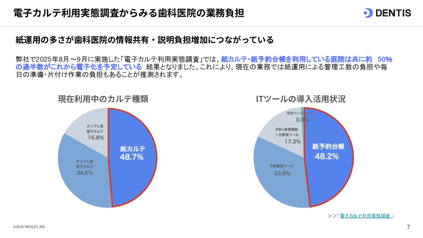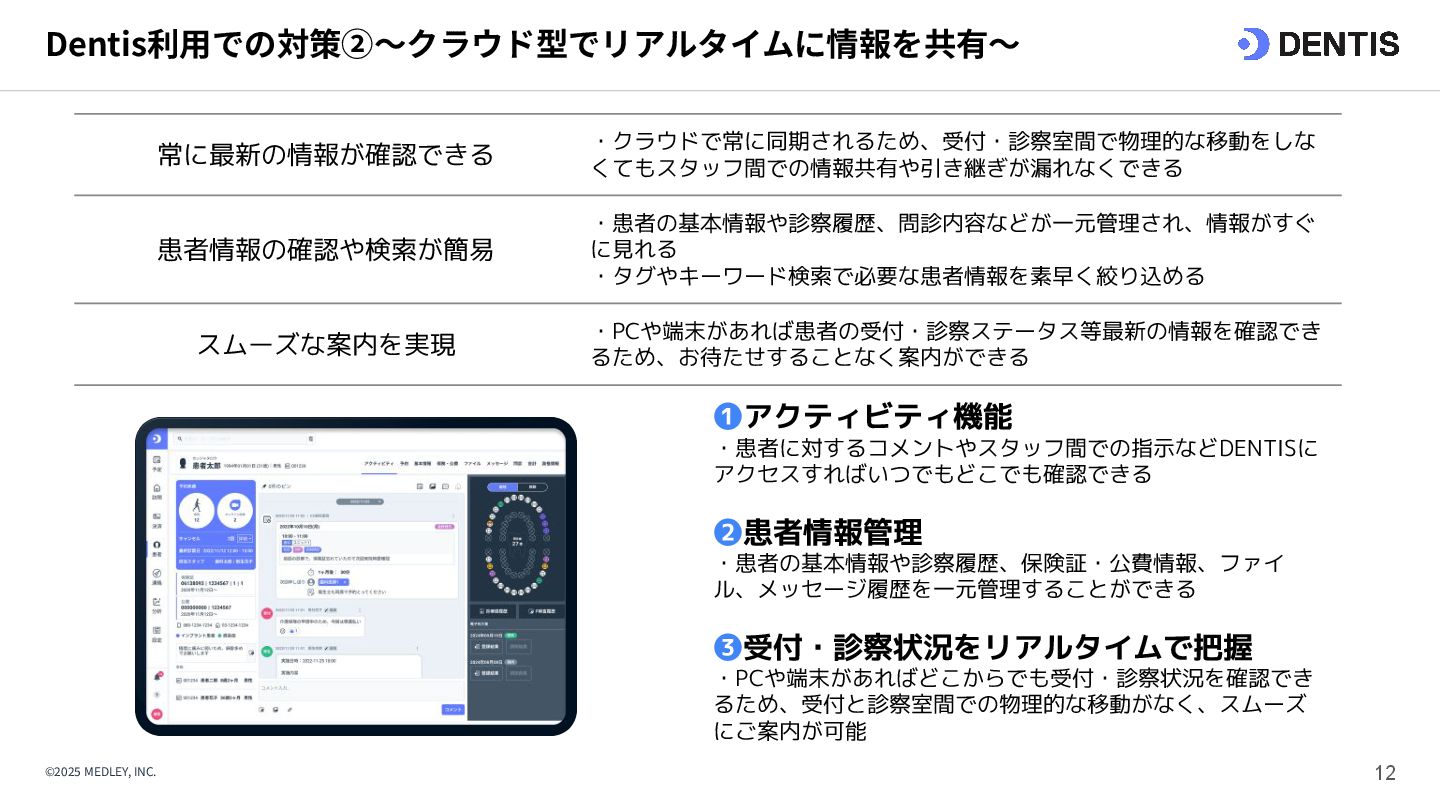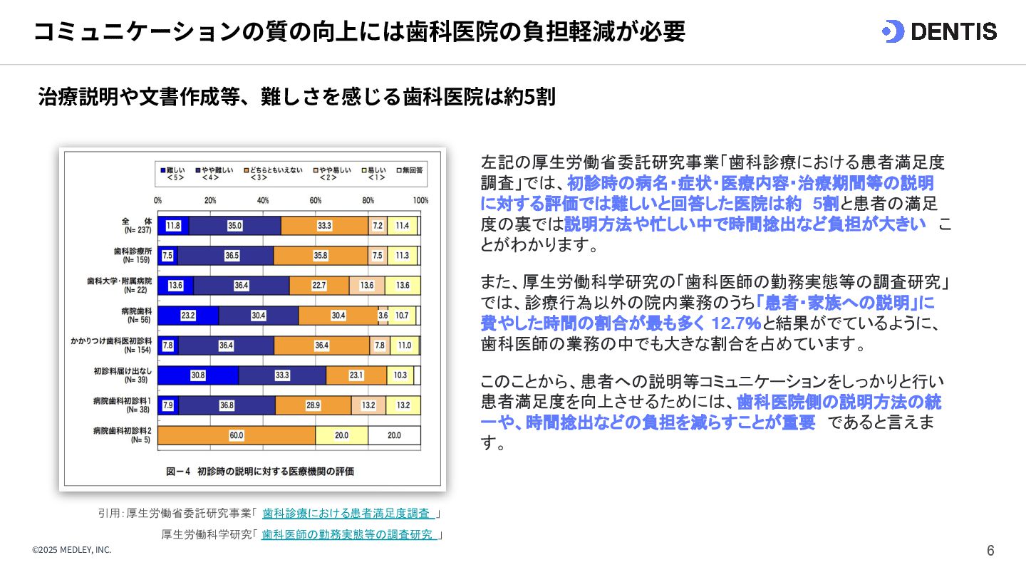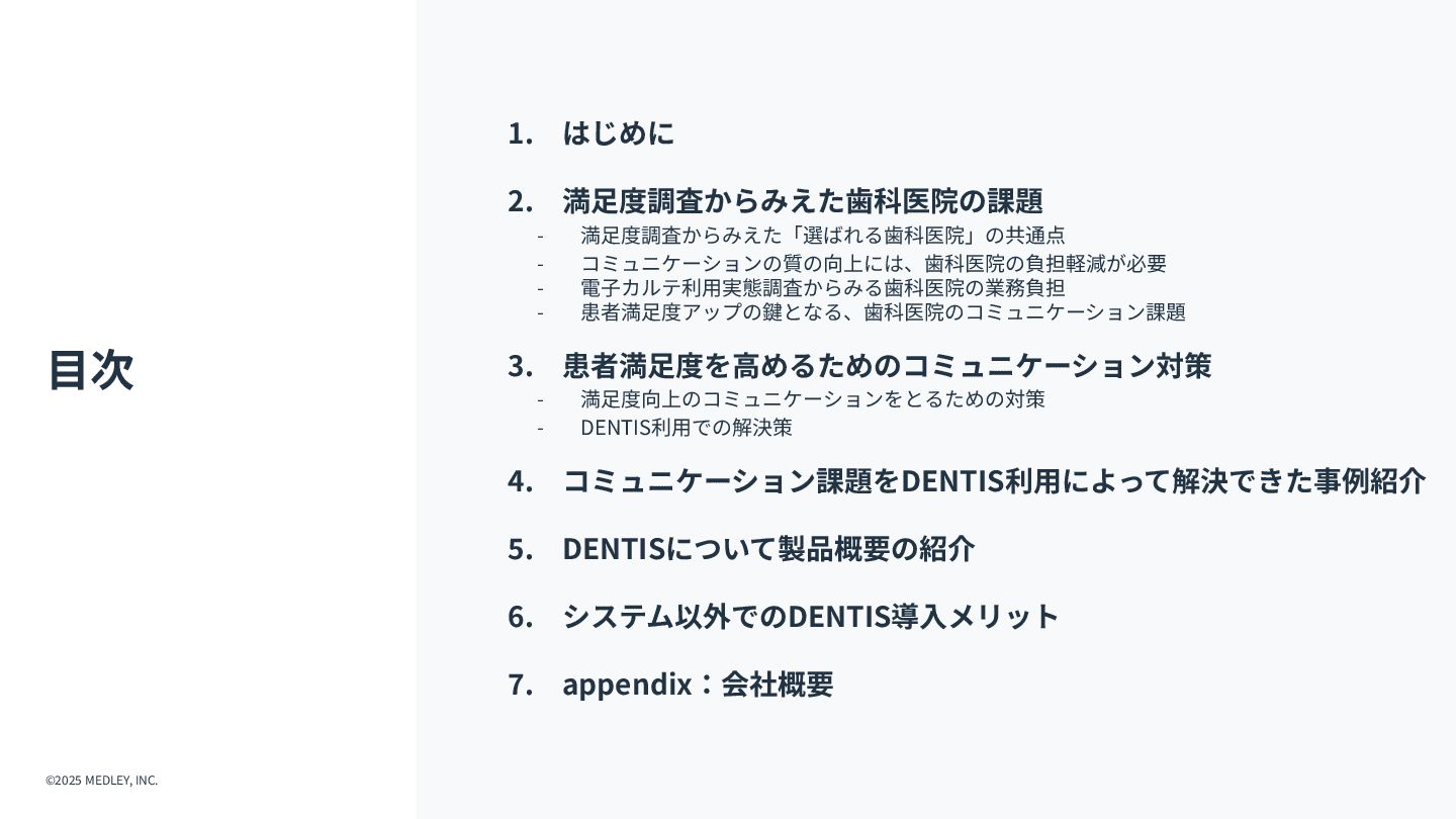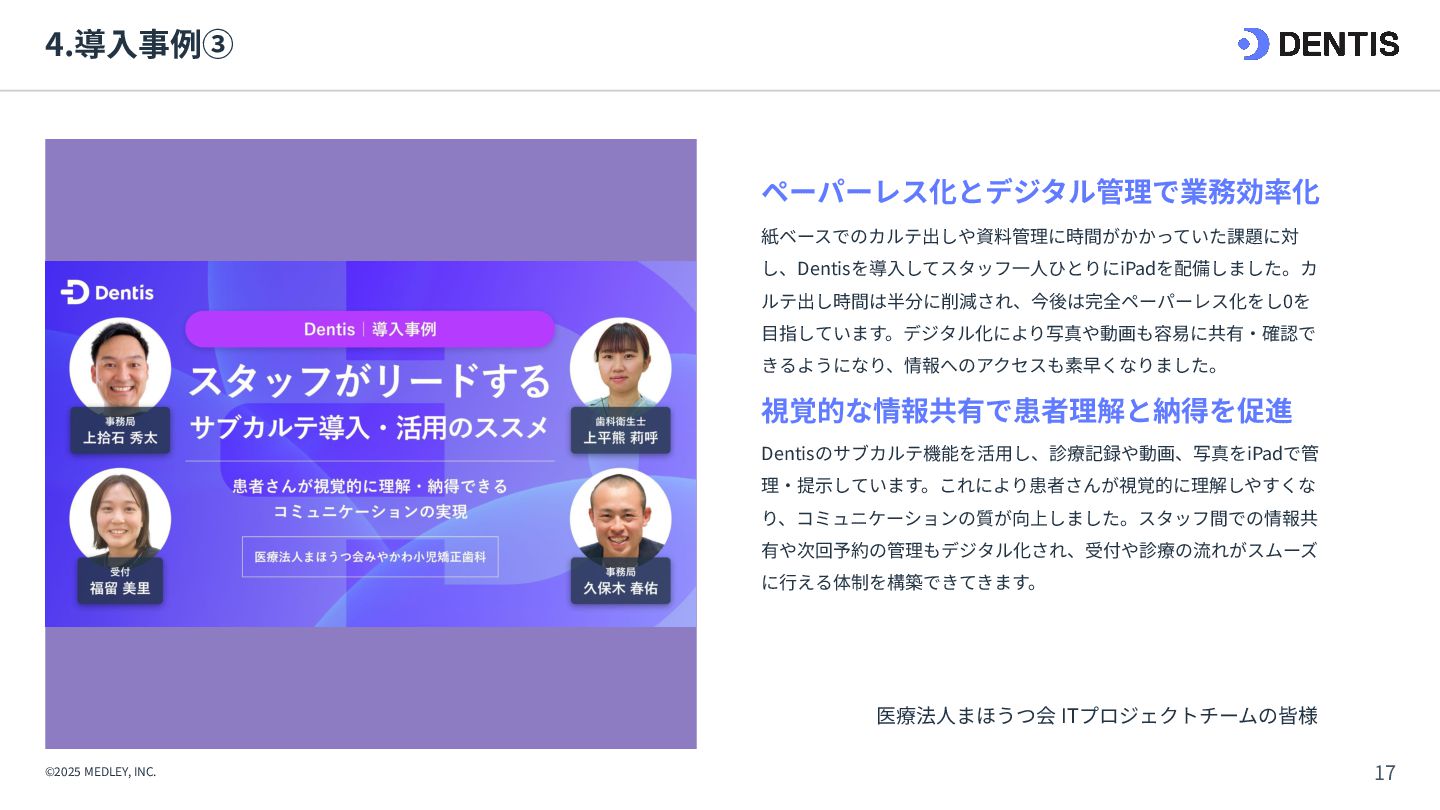 設立日 2009年6月5日 事業内容 人材プラットフォーム事業 医療プラットフォーム事業 代表者 代表取締役社長 瀧口 浩平 従業員数 1,487名(2024年12月末時点) グループ会社 株式会社パシフィックメディカル 株式会社メドレーフィナンシャルサービス 株式会社ASFON TRUST NETWORK アクシスルートホールディングス株式会社 株式会社メドレーウィズ MEDLEY US, Inc. Medley Philippines Inc. 人材プラットフォーム事業 ジョブメドレー(人材採用システム)、ジョブメドレーアカデミー(オンライン研修事業) 「ジョブメドレーアカデミー(オンライン研修事業)」 医療プラットフォーム事業 DENTIS(歯科向けシステム)、CLINICS(医科向けシステム)、 Pharms(薬局向けシステム)、 MEDLEY(患者向け医療情報サービス)、 MALL(病院向け電子カルテ) 株式会社メドレーは 2009年より「医療ヘルスケアの未来をつくる 」をミッションに事業展開 DENTISは歯科領域事業として 2022年1月からサービス開始 27 オンライン動画研修サービス 納得できる⽼⼈ホーム探し 医師たちがつくるオンライン医療事典 クラウド診療⽀援システム かかりつけ薬局⽀援システム 医療介護の求⼈サイト 病院向け電⼦カルテ 医療‧介護‧在宅連携ソリューション クラウド⻭科業務⽀援システム