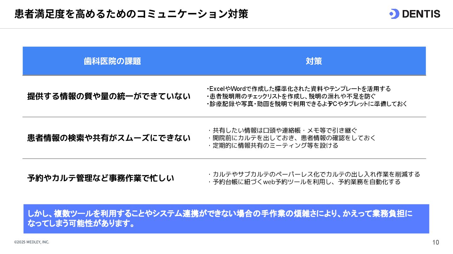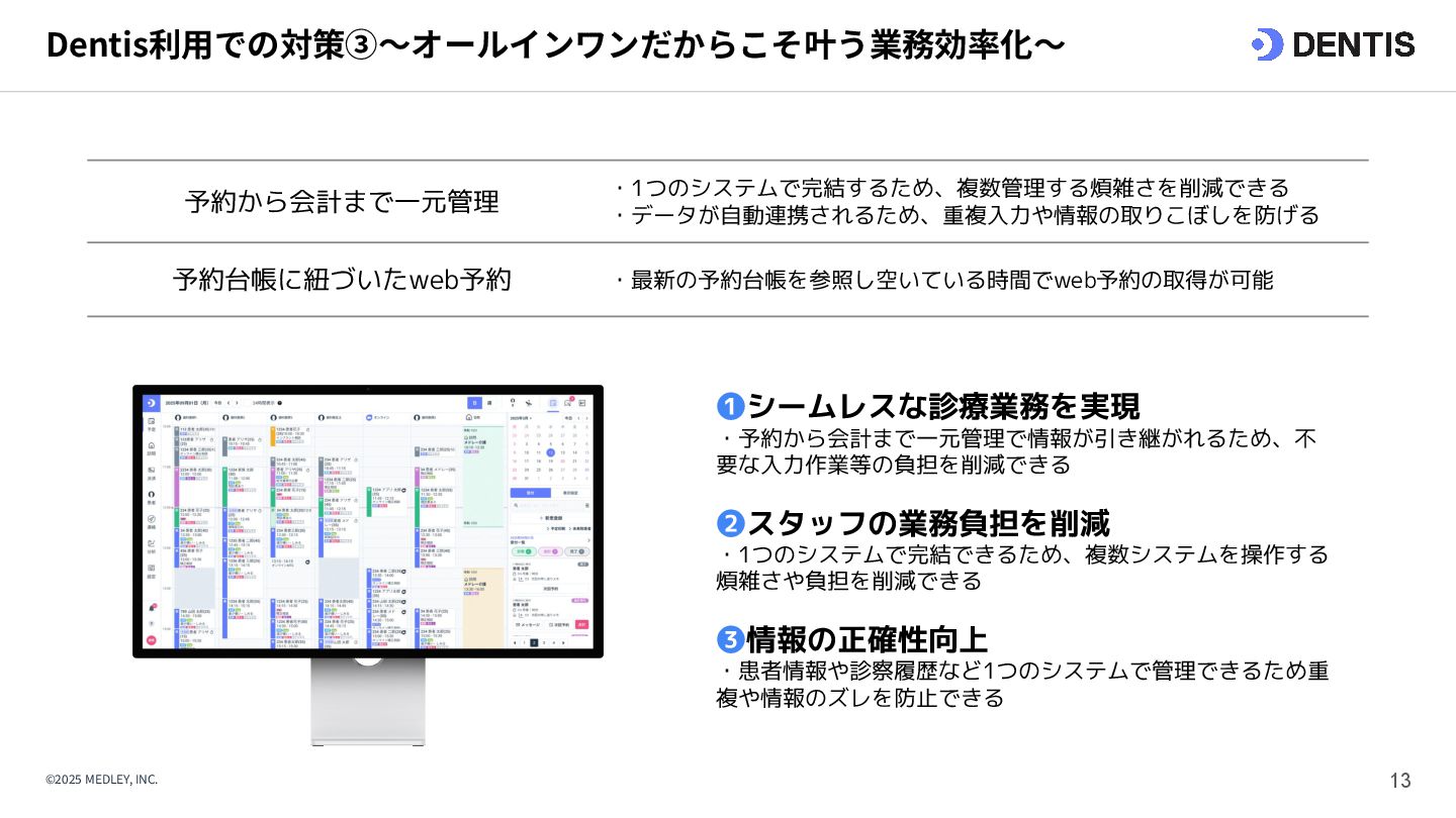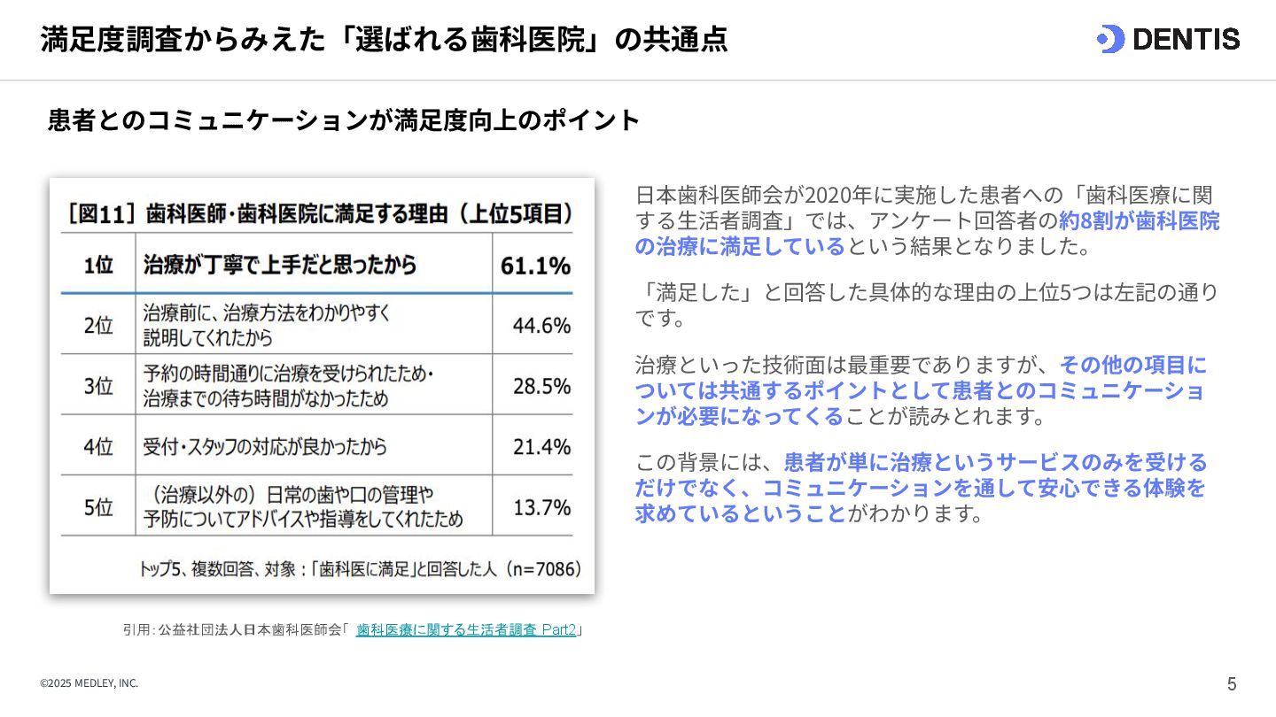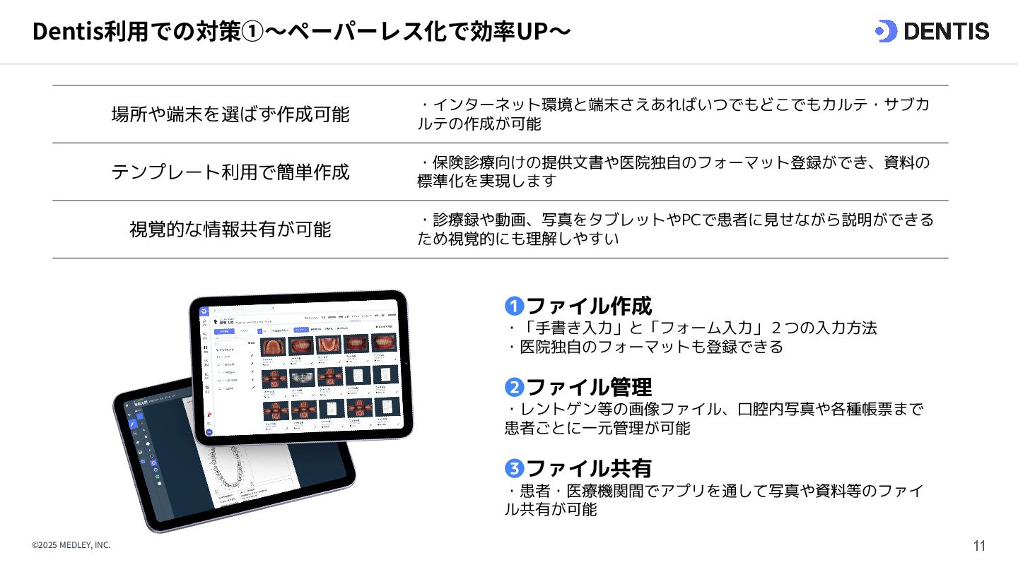 設立日 2009年6月5日 事業内容 人材プラットフォーム事業 医療プラットフォーム事業 代表者 代表取締役社長 瀧口 浩平 従業員数 1,487名(2024年12月末時点) グループ会社 株式会社パシフィックメディカル 株式会社メドレーフィナンシャルサービス 株式会社ASFON TRUST NETWORK アクシスルートホールディングス株式会社 株式会社メドレーウィズ MEDLEY US, Inc. Medley Philippines Inc. 人材プラットフォーム事業 ジョブメドレー(人材採用システム)、ジョブメドレーアカデミー(オンライン研修事業) 「ジョブメドレーアカデミー(オンライン研修事業)」 医療プラットフォーム事業 DENTIS(歯科向けシステム)、CLINICS(医科向けシステム)、 Pharms(薬局向けシステム)、 MEDLEY(患者向け医療情報サービス)、 MALL(病院向け電子カルテ) 株式会社メドレーは 2009年より「医療ヘルスケアの未来をつくる 」をミッションに事業展開 DENTISは歯科領域事業として 2022年1月からサービス開始 27 オンライン動画研修サービス 納得できる⽼⼈ホーム探し 医師たちがつくるオンライン医療事典 クラウド診療⽀援システム かかりつけ薬局⽀援システム 医療介護の求⼈サイト 病院向け電⼦カルテ 医療‧介護‧在宅連携ソリューション クラウド⻭科業務⽀援システム