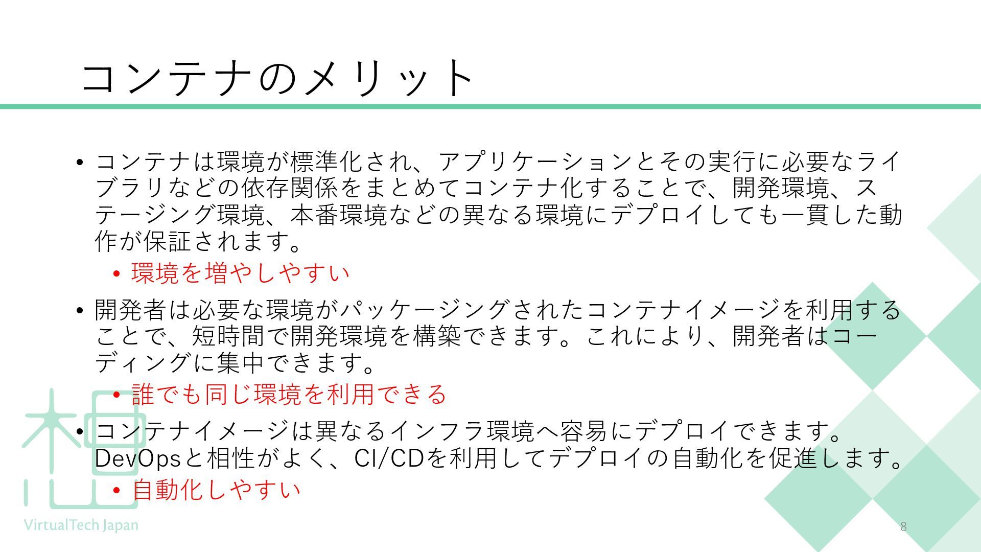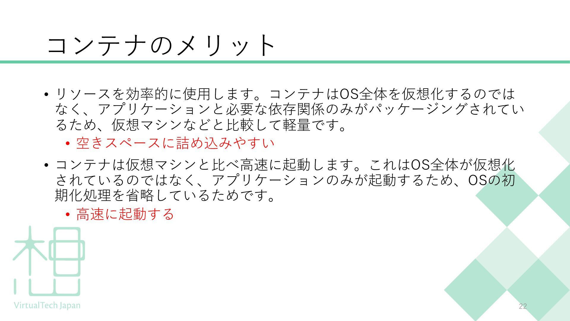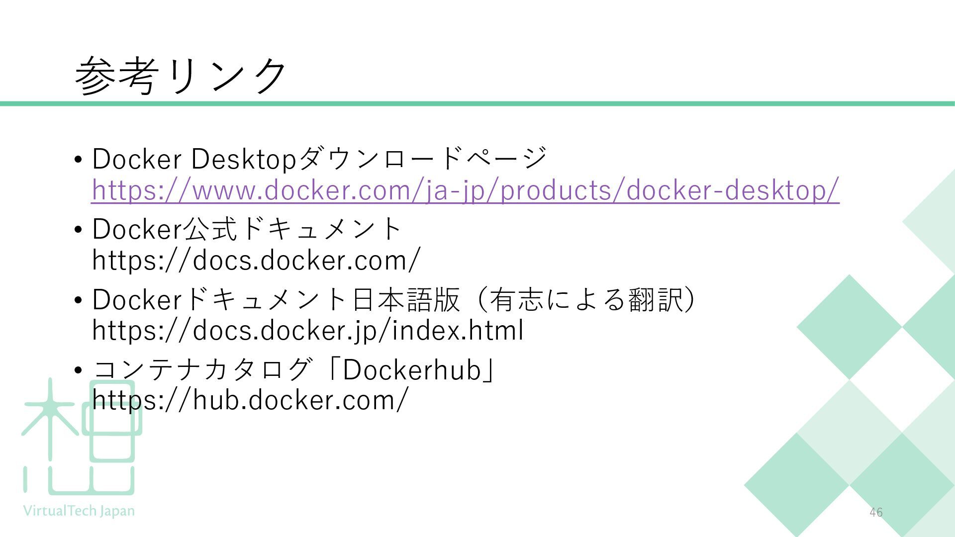 プログラミング未経験の方や、ITにあまり馴染みのない方にもわかりやすい内容となっており、聞くだけでDockerの概要を把握できる構成です。