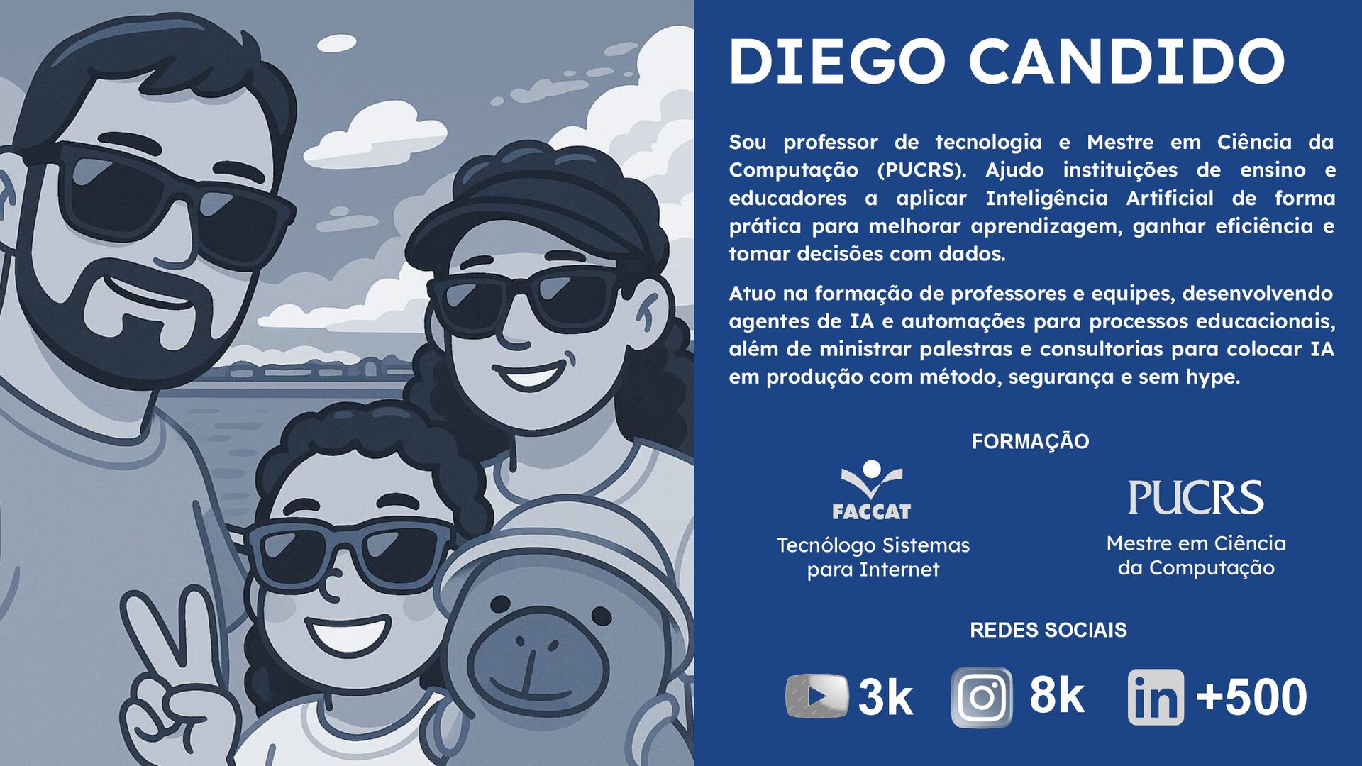 (PUCRS). Ajudo instituições de ensino e educadores a aplicar Inteligência Artificial de forma prática para melhorar aprendizagem, ganhar eficiência e tomar decisões com dados. Atuo na formação de professores e equipes, desenvolvendo agentes de IA e automações para processos educacionais, além de ministrar palestras e consultorias para colocar IA em produção com método, segurança e sem hype. DIEGO CANDIDO Mestre em Ciência da Computação 3k 8k FORMAÇÃO REDES SOCIAIS Tecnólogo Sistemas para Internet +500