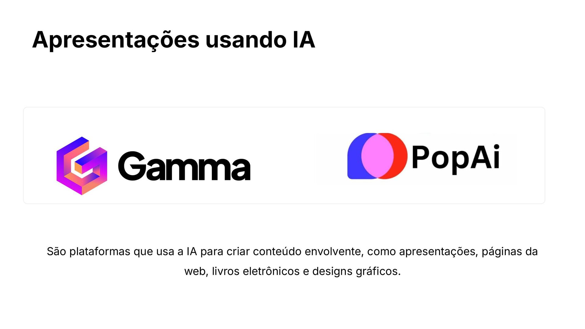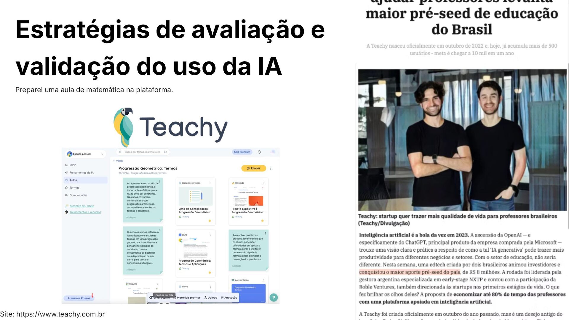 IA Generativa pode ajudar os alunos a criar histórias, poemas, músicas e até mesmo desenhos, explorando novas ideias e expressões artísticas. Aprendizagem personalizada A IA pode fornecer exercícios e conteúdos personalizados para atender às necessidades específicas de cada aluno, adaptando o ritmo e o nível de dificuldade. Pesquisa e tradução A IA pode auxiliar na pesquisa de informações, traduzir textos em tempo real e fornecer resumos de artigos complexos, tornando o aprendizado mais acessível.