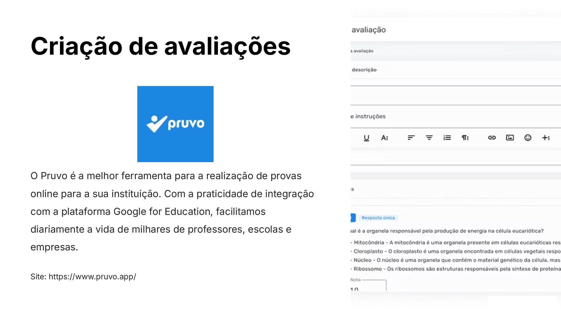 a realização de provas online para a sua instituição. Com a praticidade de integração com a plataforma Google for Education, facilitamos diariamente a vida de milhares de professores, escolas e empresas. Site: https://www.pruvo.app/