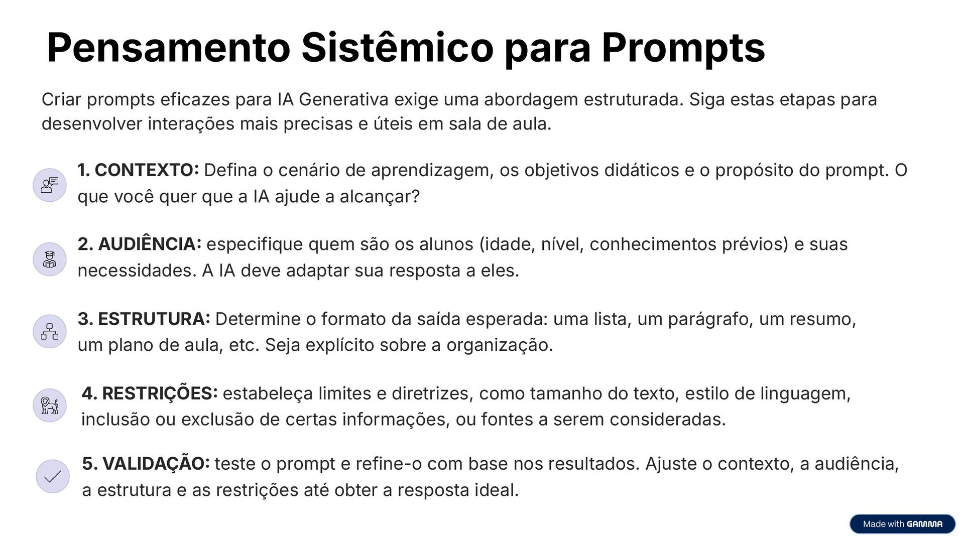exige uma abordagem estruturada. Siga estas etapas para desenvolver interações mais precisas e úteis em sala de aula. 1. CONTEXTO Defina o cenário de aprendizagem, os objetivos didáticos e o propósito do prompt. O que você quer que a IA ajude a alcançar? 2. AUDIÊNCIA especifique quem são os alunos (idade, nível, conhecimentos prévios) e suas necessidades. A IA deve adaptar sua resposta a eles. 3. ESTRUTURA Determine o formato da saída esperada: uma lista, um parágrafo, um resumo, um plano de aula, etc. Seja explícito sobre a organização. 4. RESTRIÇÕES estabeleça limites e diretrizes, como tamanho do texto, estilo de linguagem, inclusão ou exclusão de certas informações, ou fontes a serem consideradas. 5. VALIDAÇÃO teste o prompt e refine-o com base nos resultados. Ajuste o contexto, a audiência, a estrutura e as restrições até obter a resposta ideal.
