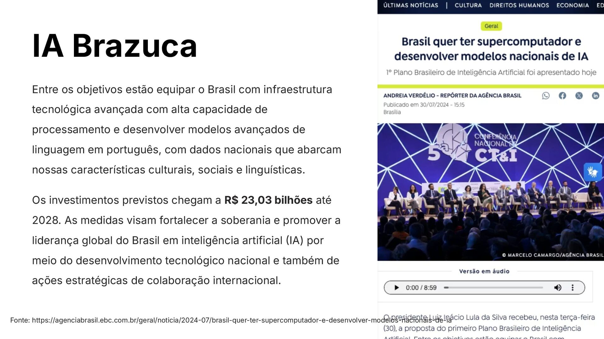 infraestrutura tecnológica avançada com alta capacidade de processamento e desenvolver modelos avançados de linguagem em português, com dados nacionais que abarcam nossas características culturais, sociais e linguísticas. Os investimentos previstos chegam a R$ 23,03 bilhões até 2028. As medidas visam fortalecer a soberania e promover a liderança global do Brasil em inteligência artificial IA) por meio do desenvolvimento tecnológico nacional e também de ações estratégicas de colaboração internacional. Fonte: https://agenciabrasil.ebc.com.br/geral/noticia/202407/brasil-quer-ter-supercomputador-e-desenvolver-modelos-nacionais-de-ia