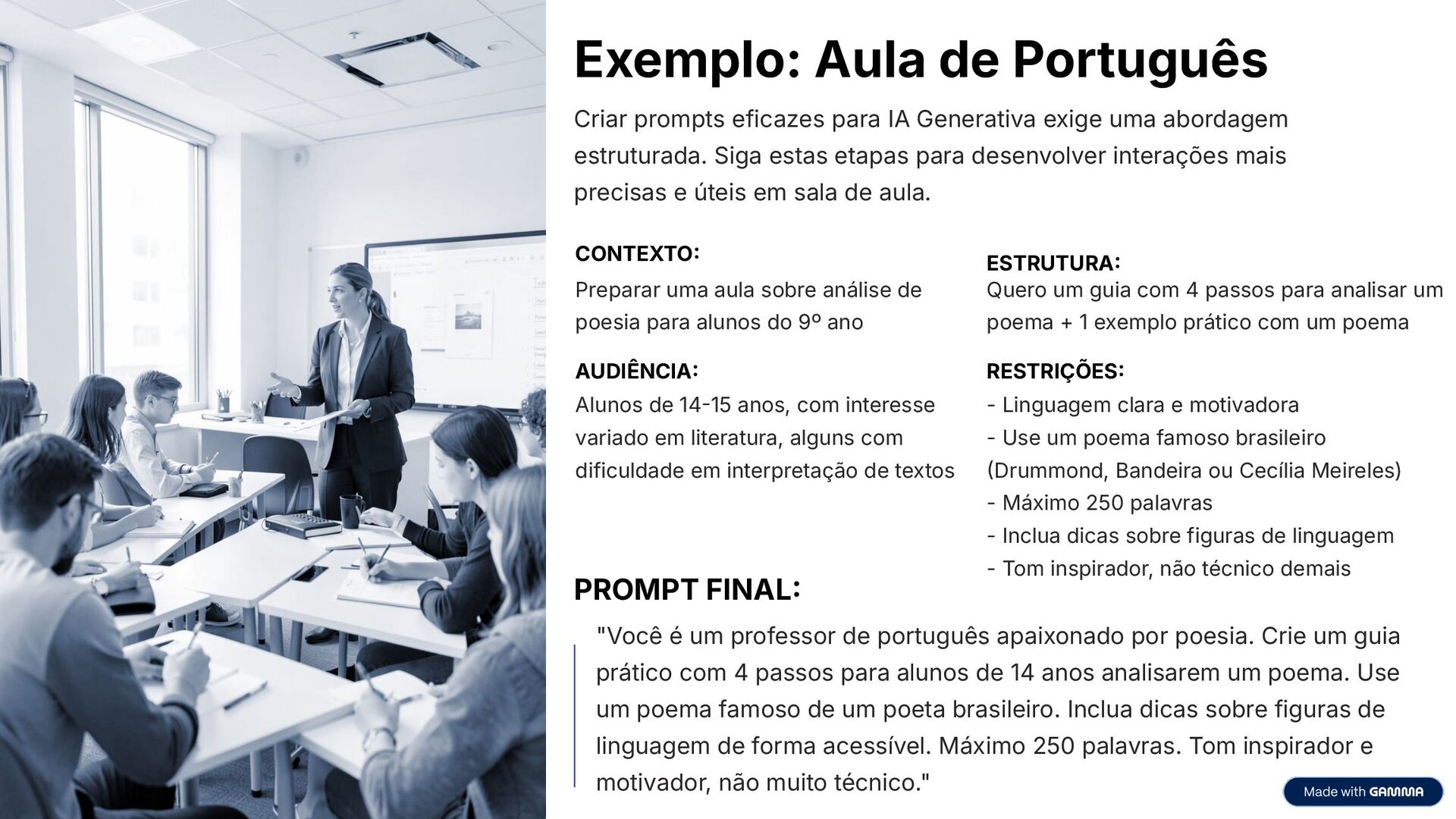 exige uma abordagem estruturada. Siga estas etapas para desenvolver interações mais precisas e úteis em sala de aula. CONTEXTO Preparar uma aula sobre análise de poesia para alunos do 9º ano AUDIÊNCIA Alunos de 1415 anos, com interesse variado em literatura, alguns com dificuldade em interpretação de textos ESTRUTURA Quero um guia com 4 passos para analisar um poema + 1 exemplo prático com um poema RESTRIÇÕES - Linguagem clara e motivadora - Use um poema famoso brasileiro Drummond, Bandeira ou Cecília Meireles) - Máximo 250 palavras - Inclua dicas sobre figuras de linguagem - Tom inspirador, não técnico demais PROMPT FINAL "Você é um professor de português apaixonado por poesia. Crie um guia prático com 4 passos para alunos de 14 anos analisarem um poema. Use um poema famoso de um poeta brasileiro. Inclua dicas sobre figuras de linguagem de forma acessível. Máximo 250 palavras. Tom inspirador e motivador, não muito técnico."