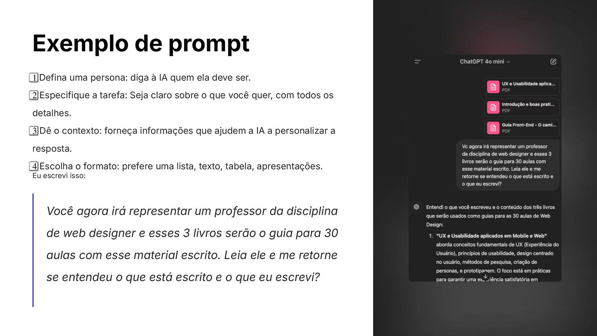 quem ela deve ser. 2⃣ Especifique a tarefa: Seja claro sobre o que você quer, com todos os detalhes. 3⃣ Dê o contexto: forneça informações que ajudem a IA a personalizar a resposta. 4⃣ Escolha o formato: prefere uma lista, texto, tabela, apresentações. Eu escrevi isso: Você agora irá representar um professor da disciplina de web designer e esses 3 livros serão o guia para 30 aulas com esse material escrito. Leia ele e me retorne se entendeu o que está escrito e o que eu escrevi?