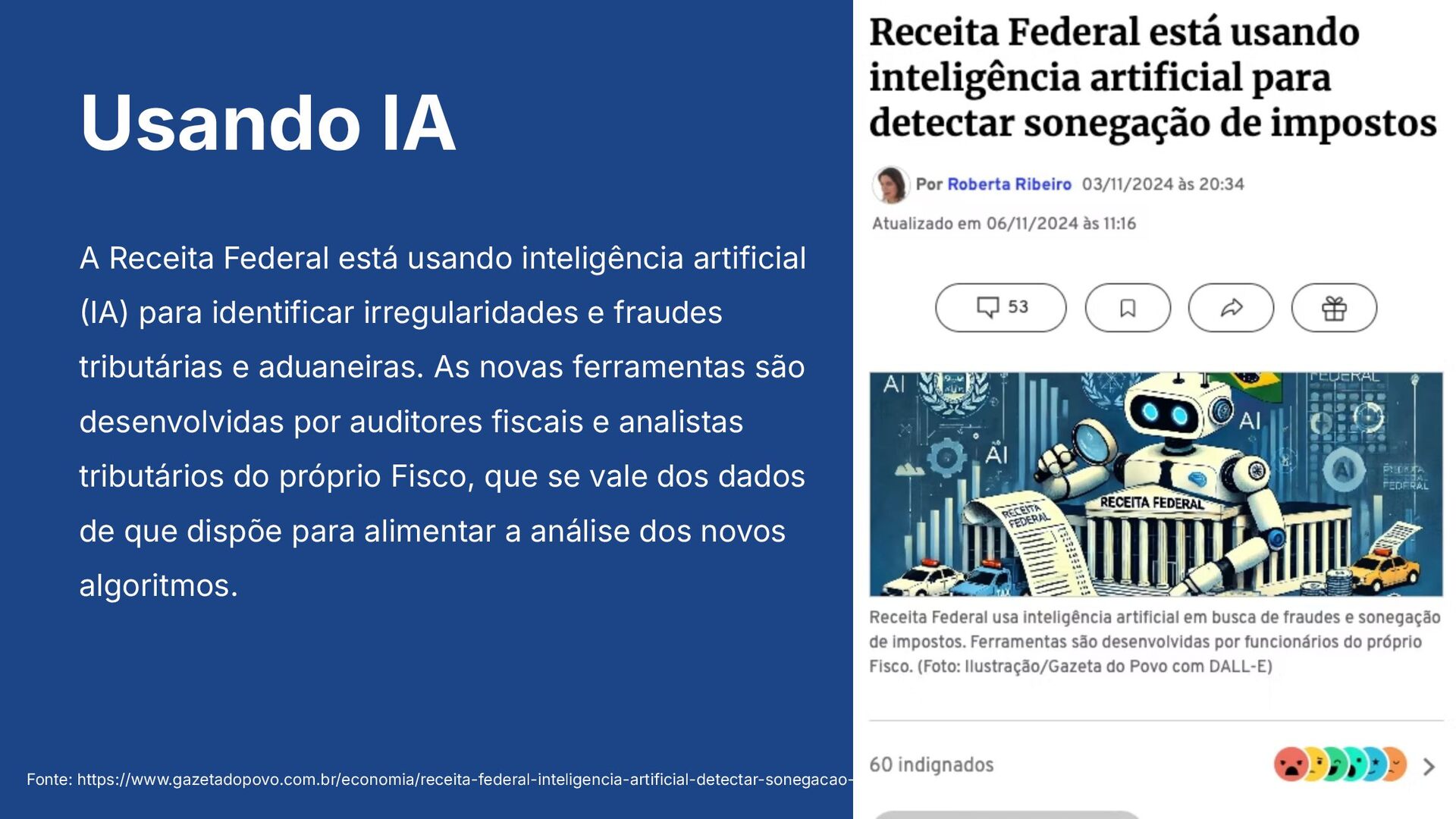 para identificar irregularidades e fraudes tributárias e aduaneiras. As novas ferramentas são desenvolvidas por auditores fiscais e analistas tributários do próprio Fisco, que se vale dos dados de que dispõe para alimentar a análise dos novos algoritmos. Fonte: https://www.gazetadopovo.com.br/economia/receita-federal-inteligencia-artificial-detectar-sonegacao-impostos/