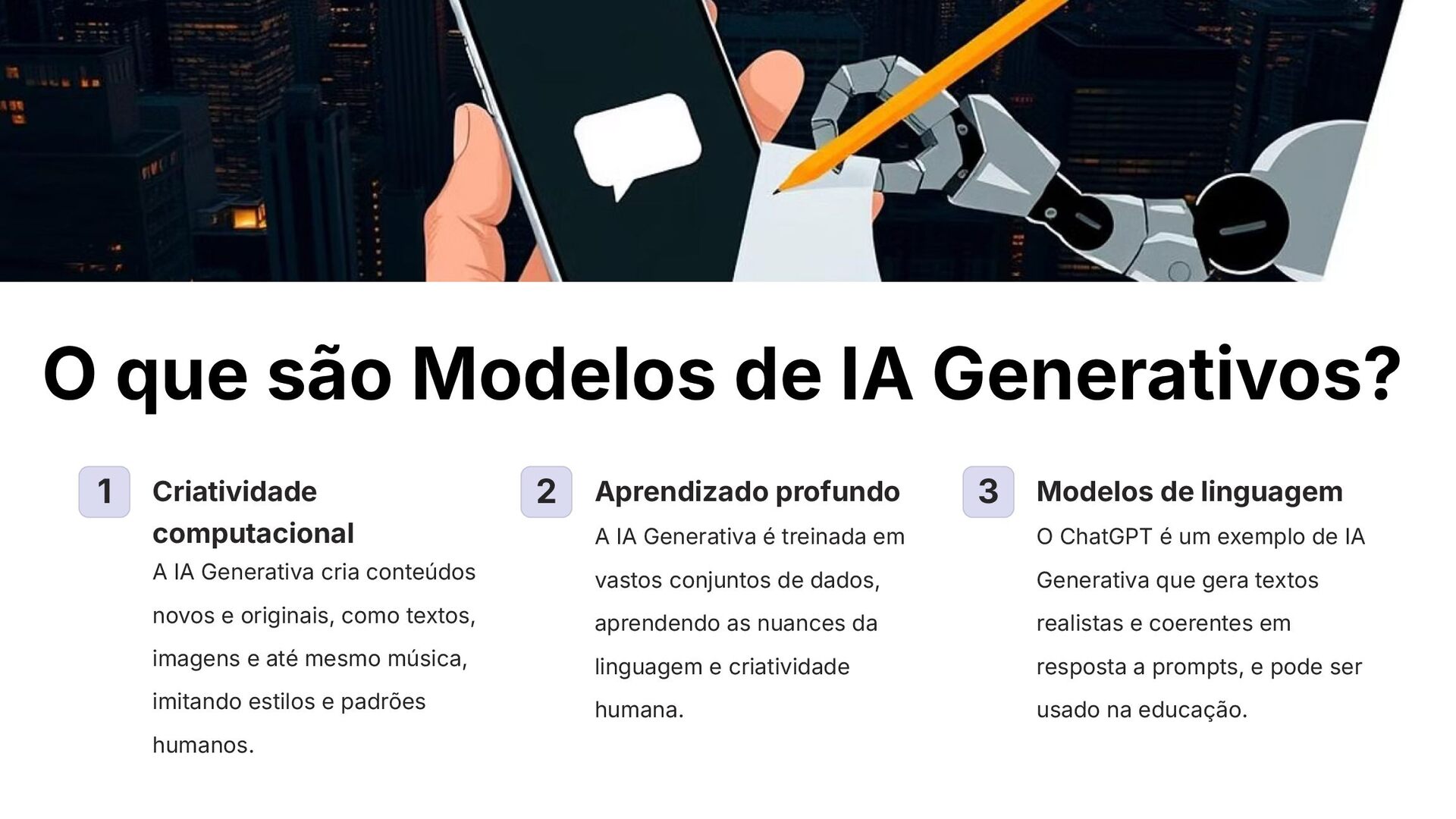 A IA Generativa cria conteúdos novos e originais, como textos, imagens e até mesmo música, imitando estilos e padrões humanos. 2 Aprendizado profundo A IA Generativa é treinada em vastos conjuntos de dados, aprendendo as nuances da linguagem e criatividade humana. 3 Modelos de linguagem O ChatGPT é um exemplo de IA Generativa que gera textos realistas e coerentes em resposta a prompts, e pode ser usado na educação.