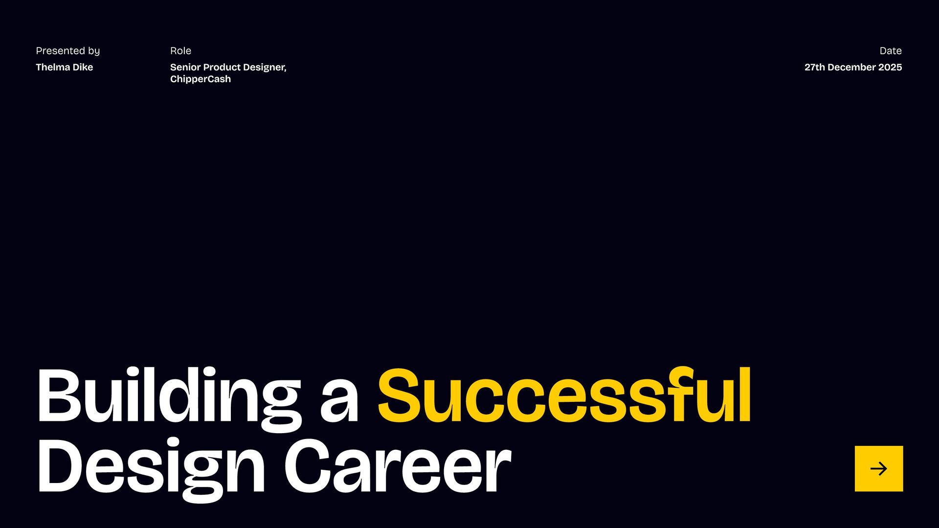 This presentation outlines my personal journey and the lessons on building a successful career in design, drawing from over eight years of experience across fintech, regulated industries, and high-tech companies. It traces my growth from early roles at IGHub and SIH/Hotels.ng—where I built foundational skills, networks, and technical experience—through key turning points at Softcom, Flutterwave, and ChipperCash, which strengthened my product thinking, end-to-end design skills, and career trajectory. The talk highlights how different environments (startups, big fintech, international teams) contributed to both professional growth and financial stability. The core message emphasizes mastering design fundamentals, developing strong soft skills, networking, staying flexible and strategic, and aiming to be a well-rounded generalist to stand out—especially in the AI era.