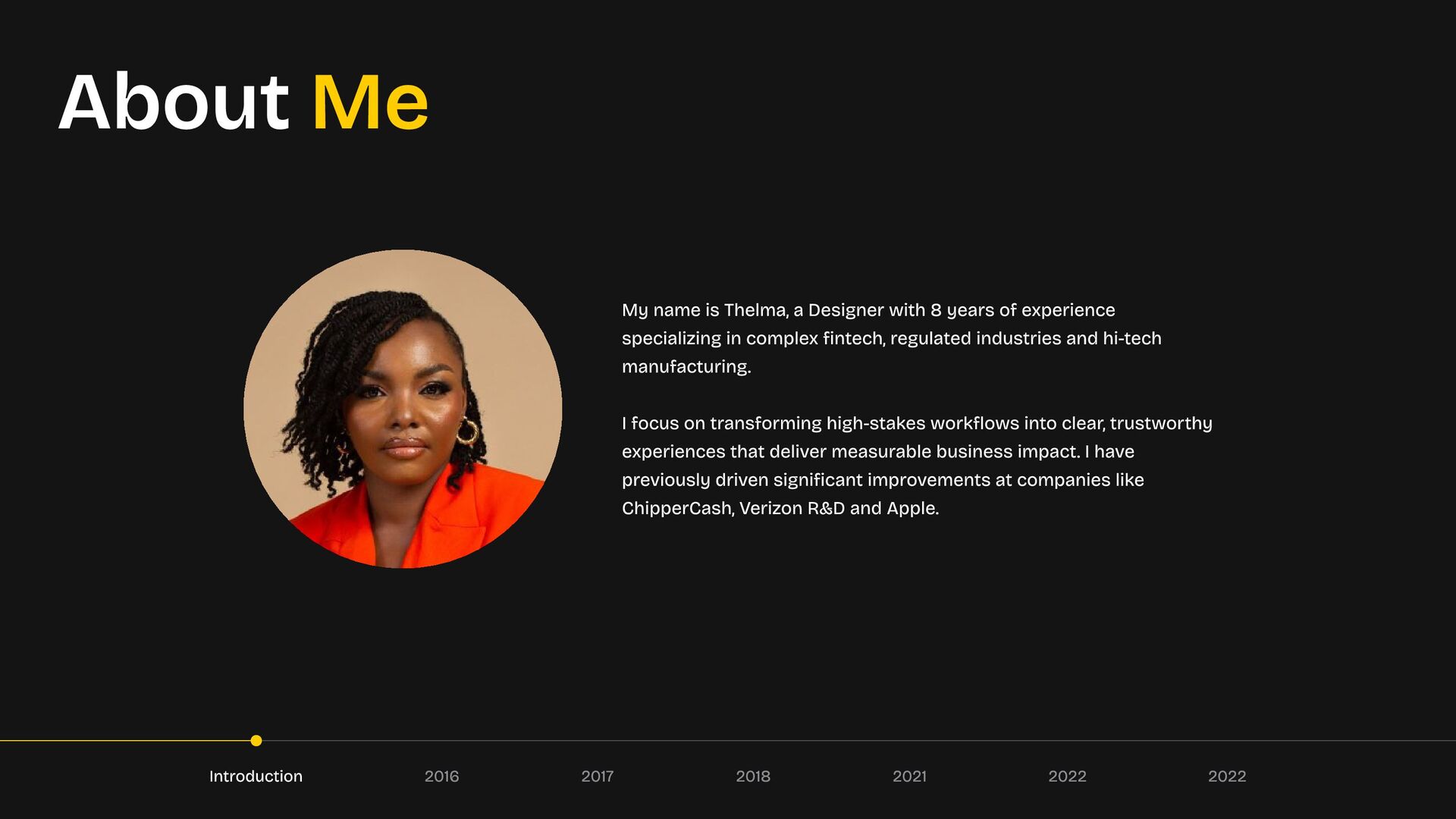 name is Thelma, a Designer with 8 years of experience specializing in complex fintech, regulated industries and hi-tech manufacturing.
