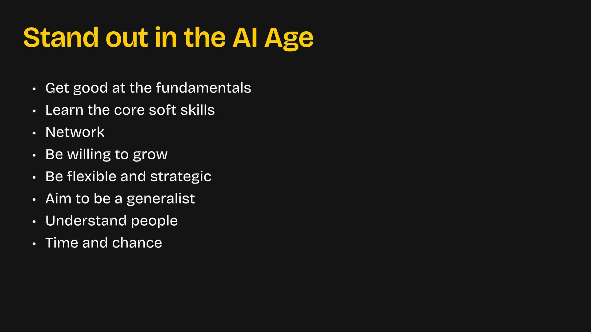 fundamentals Learn the core soft skills Network Be willing to grow Be flexible and strategic Aim to be a generalist Understand people Time and chance