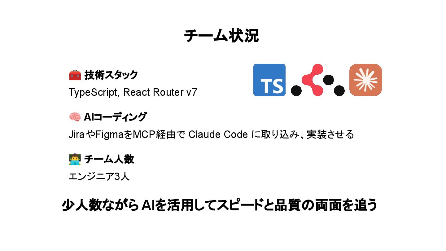1. チーム状況 🧰 技術スタック TypeScript, React Router v7 🧠 AIコーディング JiraやFigmaをMCP経由で