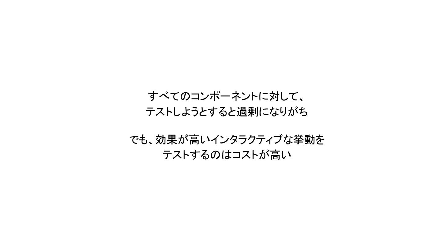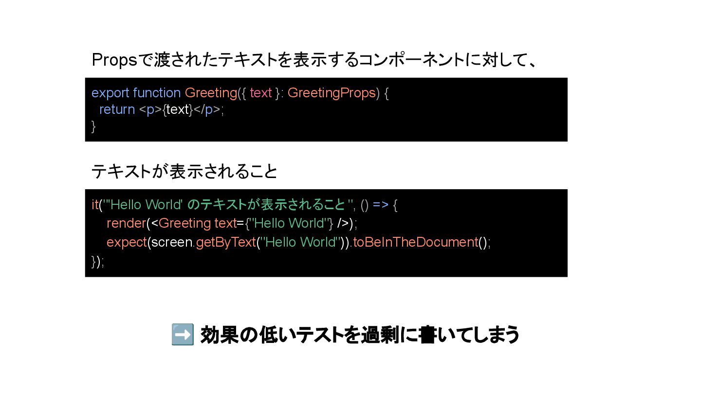 />); expect(screen.getByText("Hello World")).toBeInTheDocument(); }); export function Greeting({ text }: GreetingProps) { return <p>{text}</p>; } Propsで渡されたテキストを表示するコンポーネントに対して、 テキストが表示されること ➡ 効果の低いテストを過剰に書いてしまう