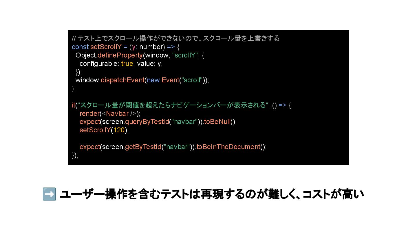 3. ➡ ユーザー操作を含むテストは再現するのが難しく、コストが高い // テスト上でスクロール操作ができないので、スクロール量を上書きする const setScrollY = (y: number) =>