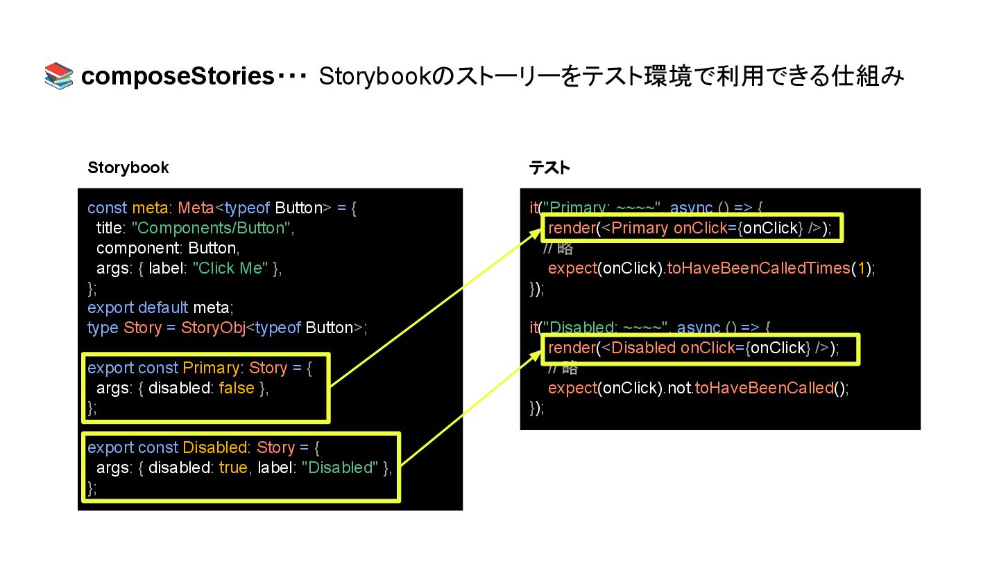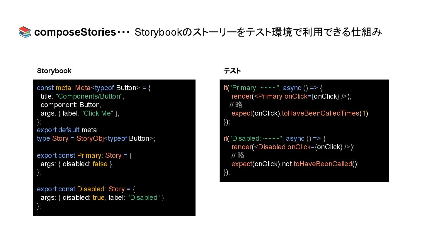 4. 📚 composeStories・・・ Storybookのストーリーをテスト環境で利用できる仕組み const meta: Meta<typeof Button> = { title:
