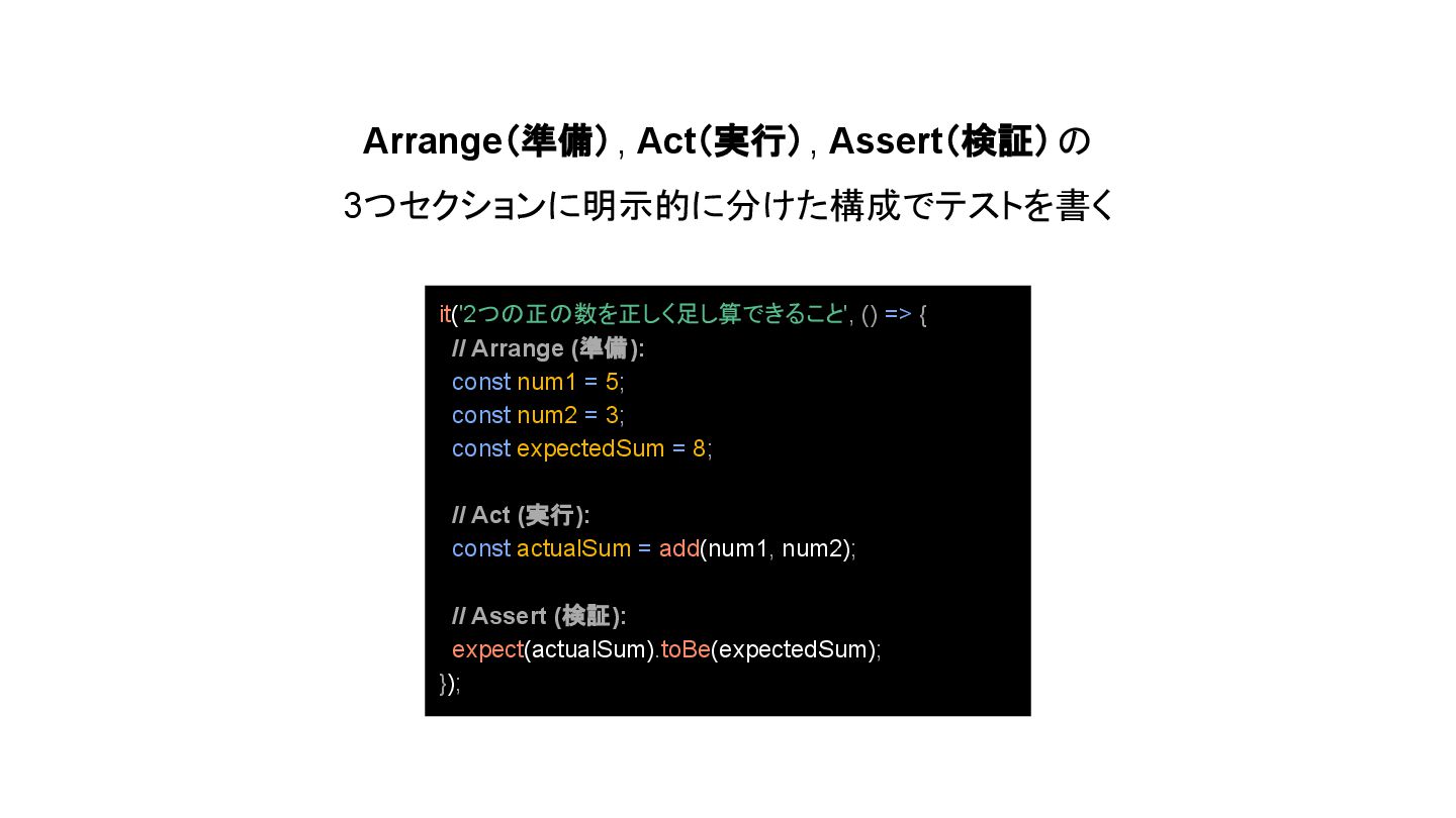 (準備): const num1 = 5; const num2 = 3; const expectedSum = 8; // Act (実行): const actualSum = add(num1, num2); // Assert (検証): expect(actualSum).toBe(expectedSum); });