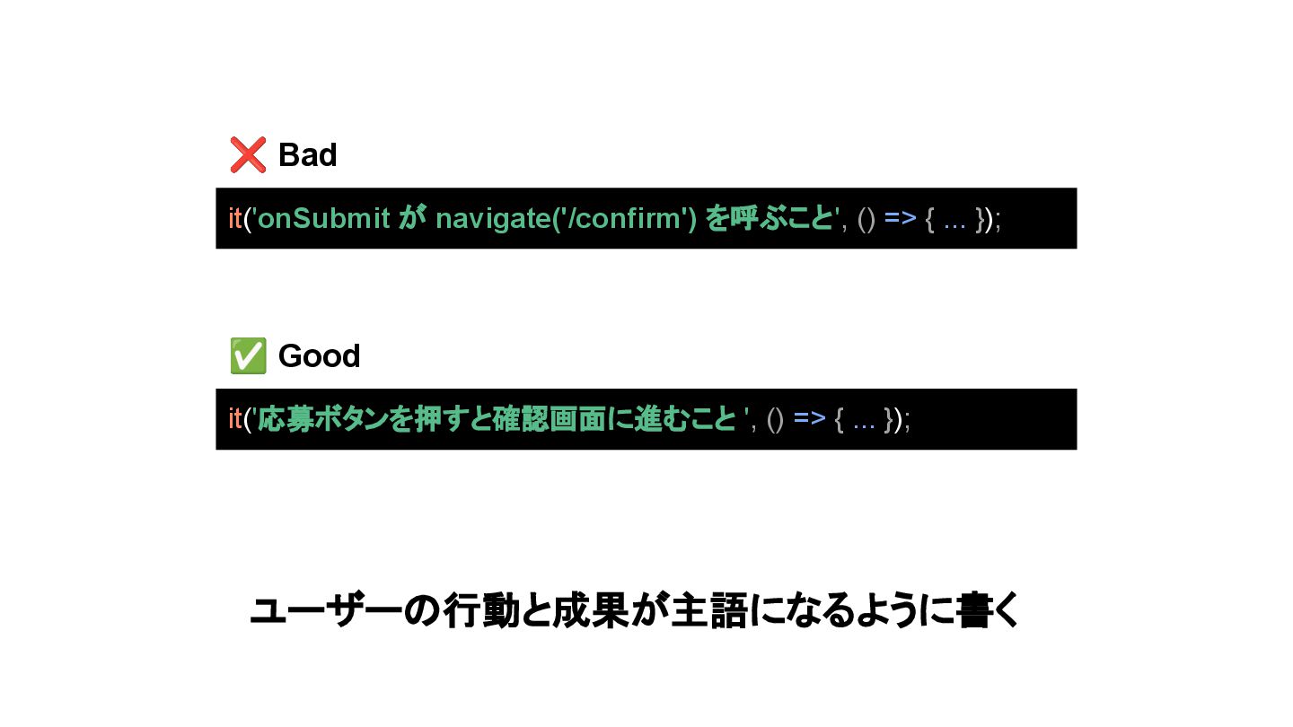Bad it('onSubmit が navigate('/confirm') を呼ぶこと', () => { ... }); ユーザーの行動と成果が主語になるように書く