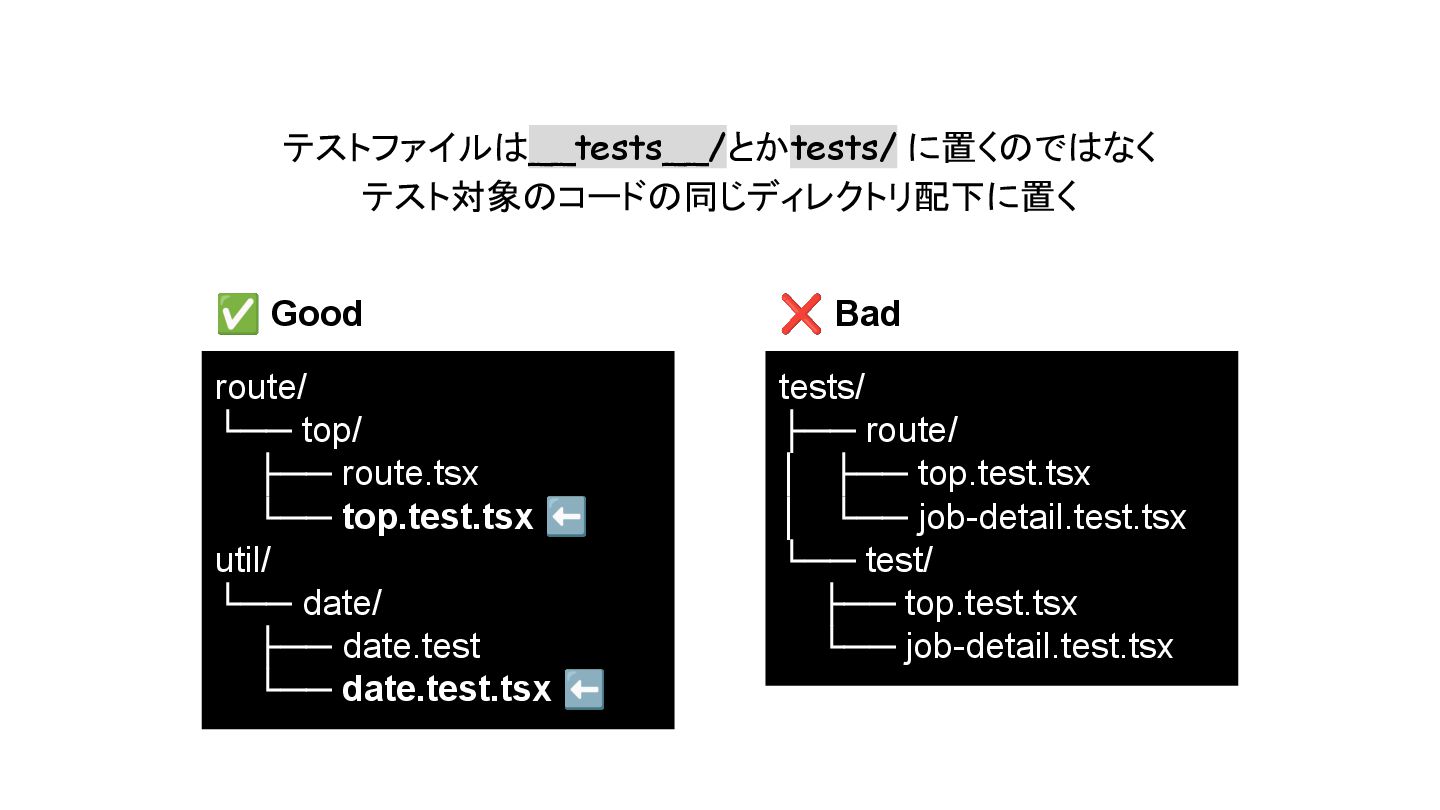 ⬅ util/ └── date/ ├── date.test └── date.test.tsx ⬅ tests/ ├── route/ │ ├── top.test.tsx │ └── job-detail.test.tsx └── test/ ├── top.test.tsx └── job-detail.test.tsx ✅ Good ❌ Bad
