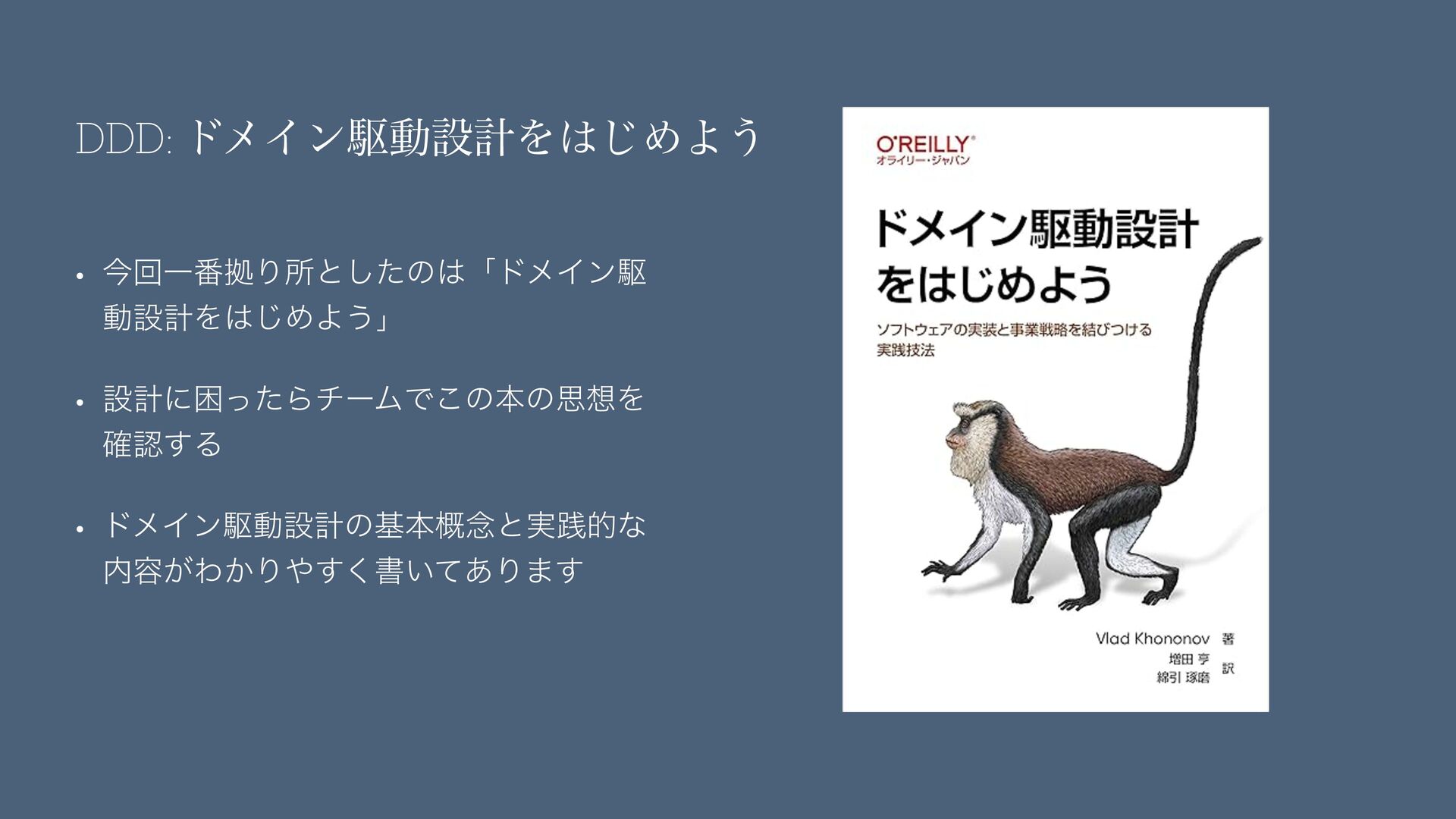 • ࠓճҰ൪ڌΓॴͱͨ͠ͷʮυϝΠϯۦ ಈઃܭΛ͡ΊΑ͏ʯ • ઃܭʹࠔͬͨΒνʔϜͰ͜ͷຊͷࢥΛ ֬ೝ͢Δ • υϝΠϯۦಈઃܭͷجຊ֓೦ͱ࣮ફతͳ ༰͕Θ͔Γ͘͢ॻ͍ͯ͋Γ·͢ DDD: