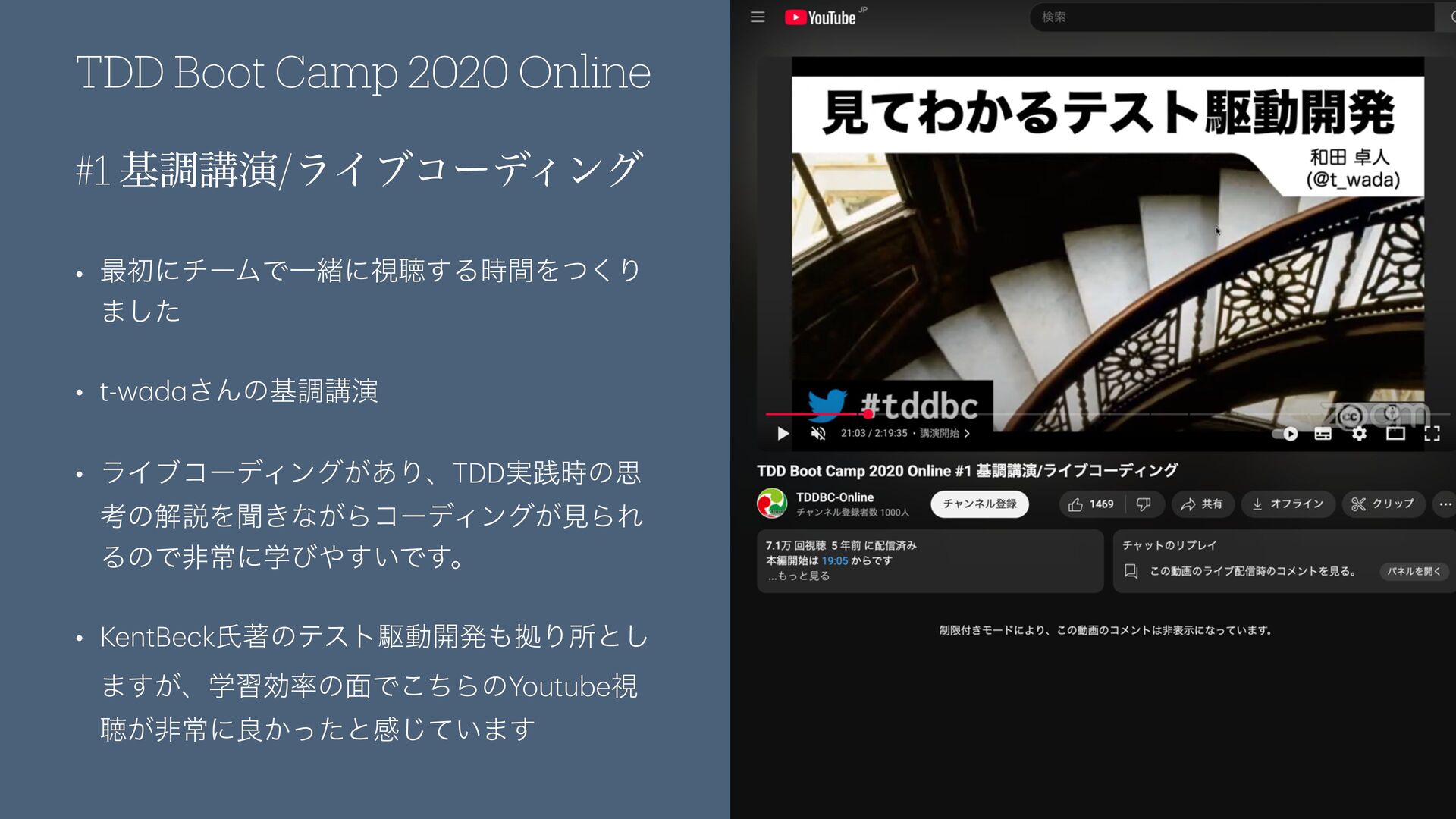 • t-w a d a ͞Μͷجௐߨԋ • ϥΠϒίʔσΟϯά͕͋ΓɺTDD࣮ફ࣌ͷࢥ ߟͷղઆΛฉ͖ͳ͕ΒίʔσΟϯά͕ݟΒΕ ΔͷͰඇৗʹֶͼ͍͢Ͱ͢ɻ • KentBeckࢯஶͷςετۦಈ։ൃڌΓॴͱ͠ ·͕͢ɺֶशޮͷ໘Ͱͪ͜ΒͷYoutubeࢹ ௌ͕ඇৗʹྑ͔ͬͨͱײ͍ͯ͡·͢