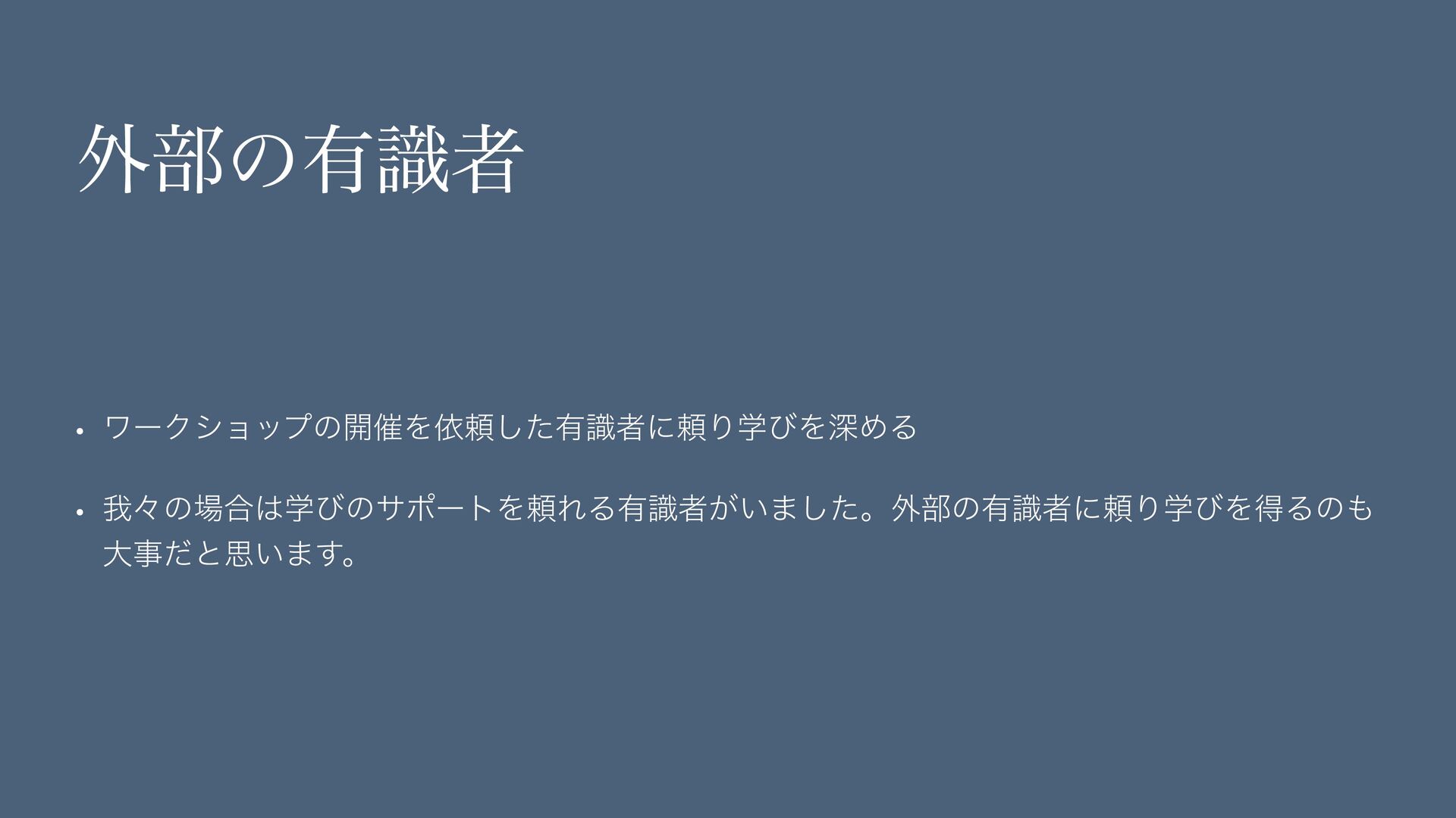 ֎෦ͷ༗ࣝऀ • ϫʔΫγϣοϓͷ։࠵Λґཔͨ͠༗ࣝऀʹཔΓֶͼΛਂΊΔ • զʑͷ߹ֶͼͷαϙʔτΛཔΕΔ༗ࣝऀ͕͍·ͨ͠ɻ֎෦ͷ༗ࣝऀʹཔΓֶͼΛಘΔͷ େࣄͩͱࢥ͍·͢ɻ