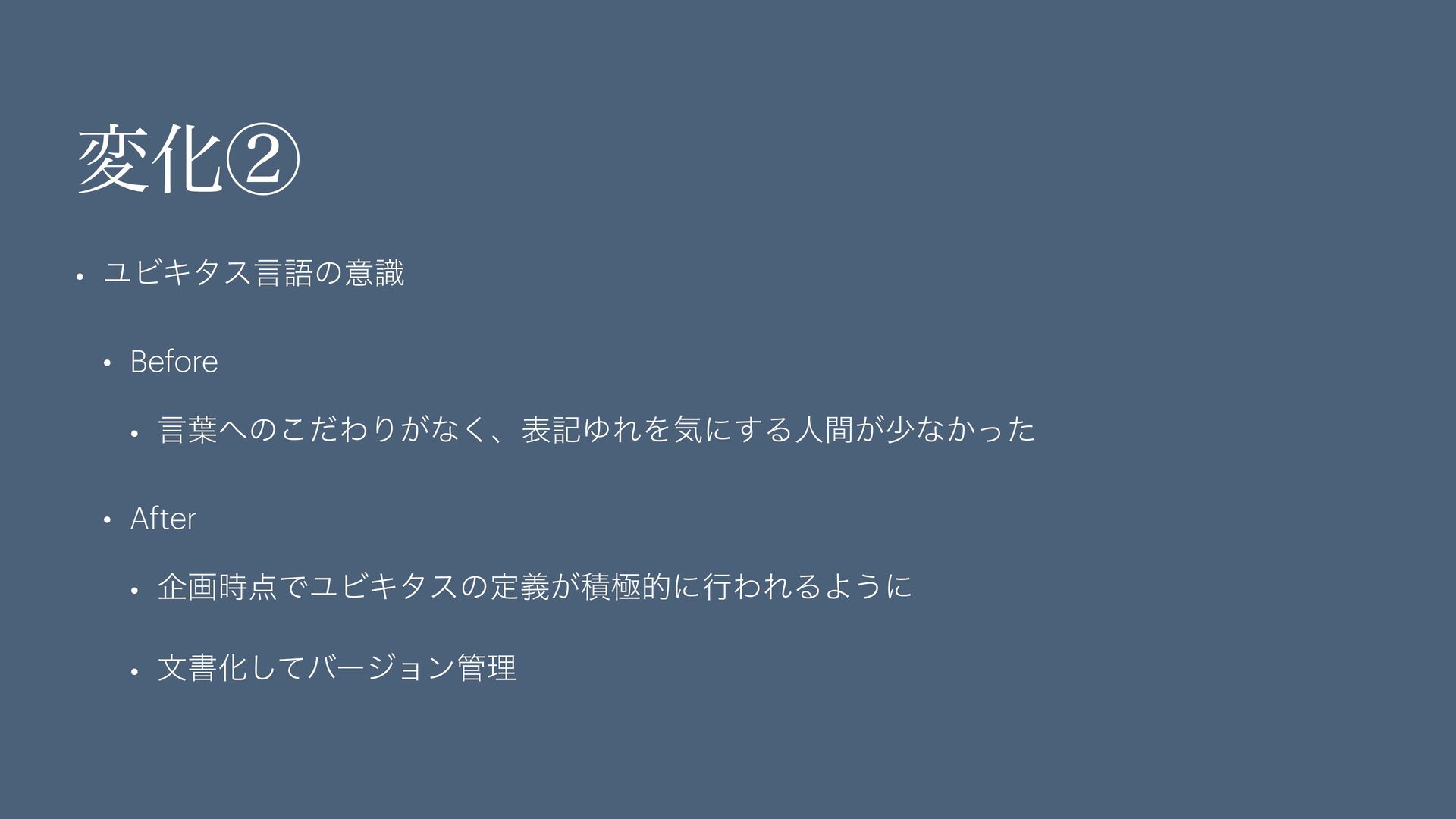 มԽᶄ • ϢϏΩλεݴޠͷҙࣝ • Before • ݴ༿ͷͩ͜ΘΓ͕ͳ͘ɺදهΏΕΛؾʹ͢Δਓ͕ؒগͳ͔ͬͨ • After •