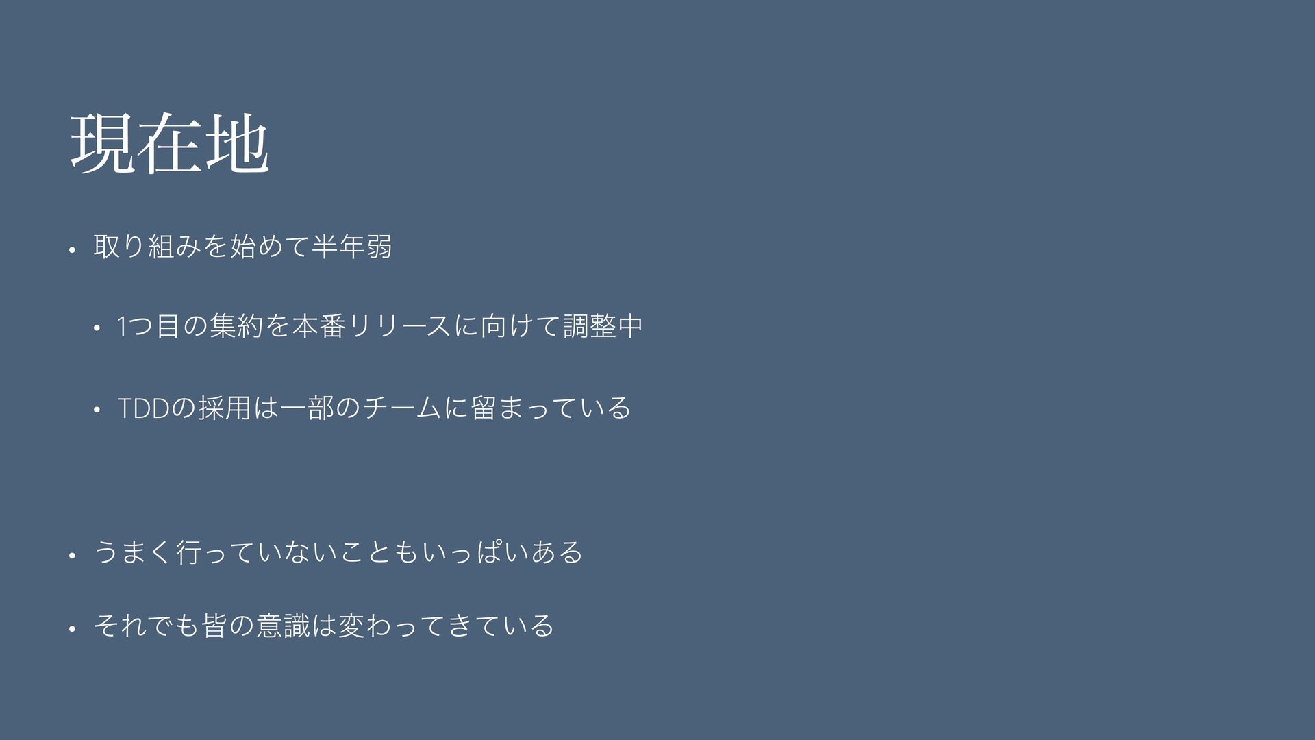 ݱࡏ • औΓΈΛ࢝Ίͯऑ • 1ͭͷूΛຊ൪ϦϦʔεʹ͚ͯௐத • TDDͷ࠾༻Ұ෦ͷνʔϜʹཹ·͍ͬͯΔ • ͏·͘ߦ͍ͬͯͳ͍͜ͱ͍ͬͺ͍͋Δ •